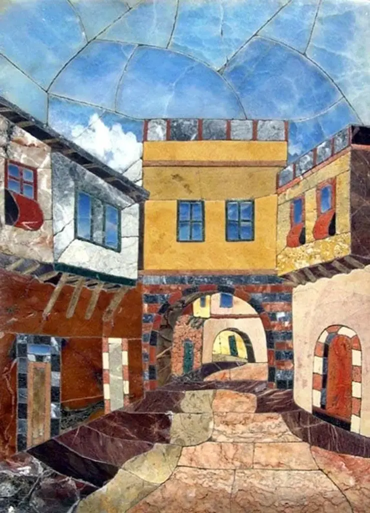 This is an amazing handmade marble mosaic of a beautiful landscape of a city market. It is composed of all natural stones and artistic tiles. Using the sec-tile technique natural tiles are cut into different patterns and shapes to fit the component parts of the given design.