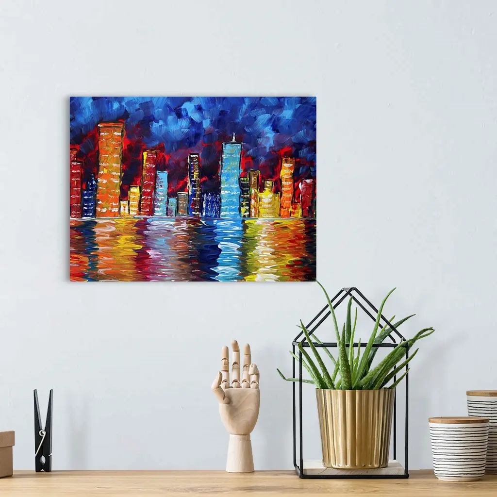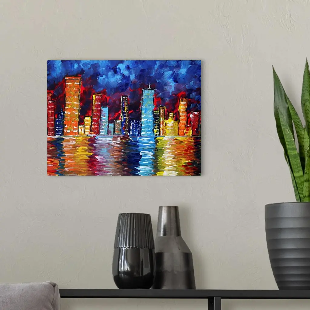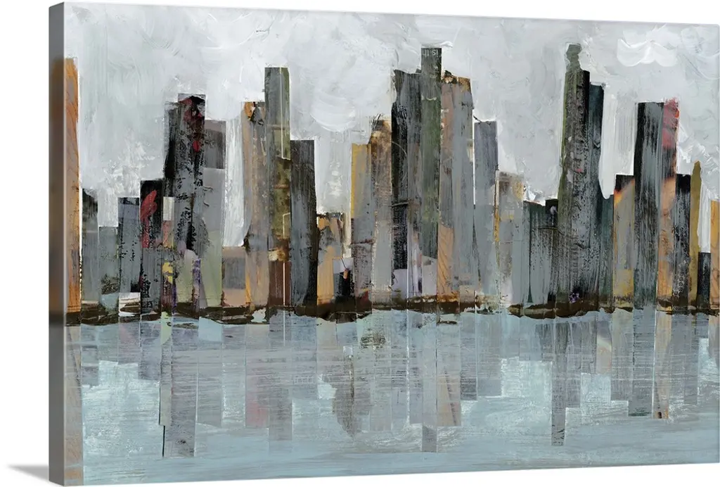 Landscape, large contemporary art of skyscrapers reflecting over water. Painted with very heavy and deliberate brush strokes.
