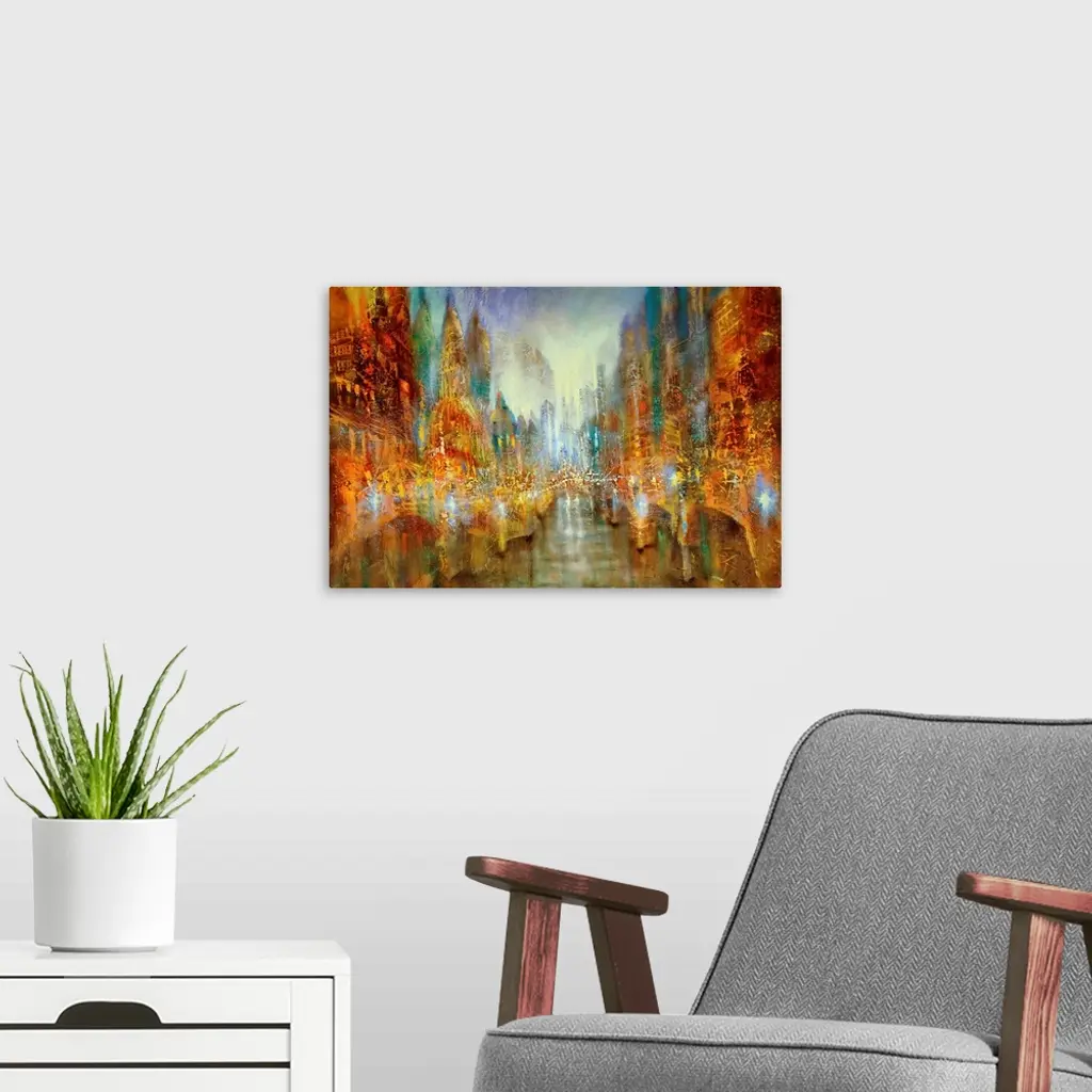 Abstractly painted cityscape in bright colors and structures: a large, lively city in red, orange and blue with the silhouette of skyscrapers. Reflection in the water; abstract painted old bridge with arches.