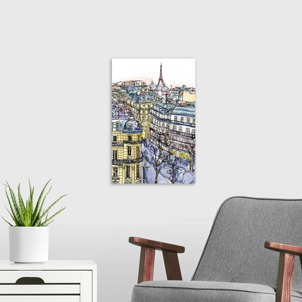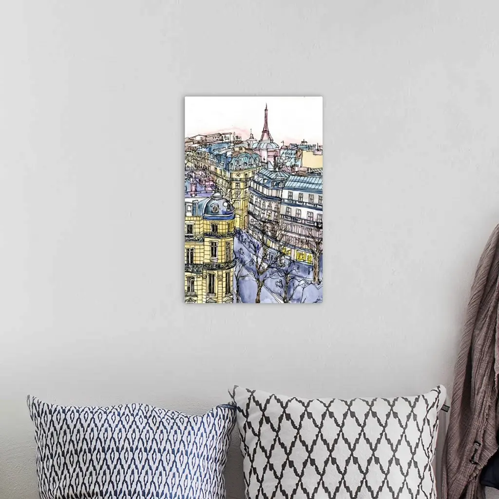Illustrated cityscape of Paris with a view of the Eiffel Tower and urban buildings.