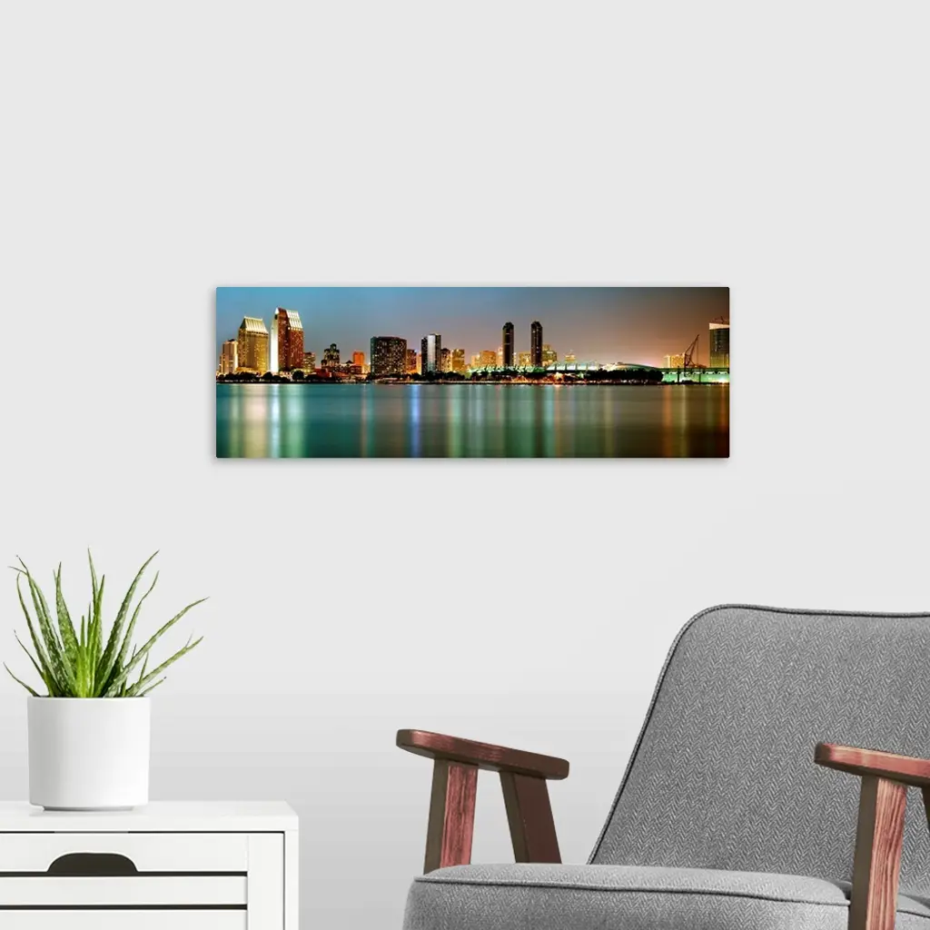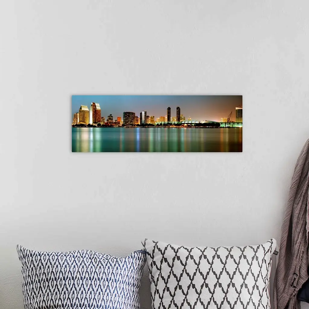 City lights reflect in still waters of the cityscape panoramic wall art.