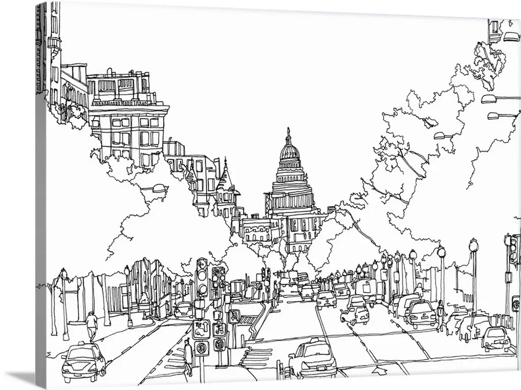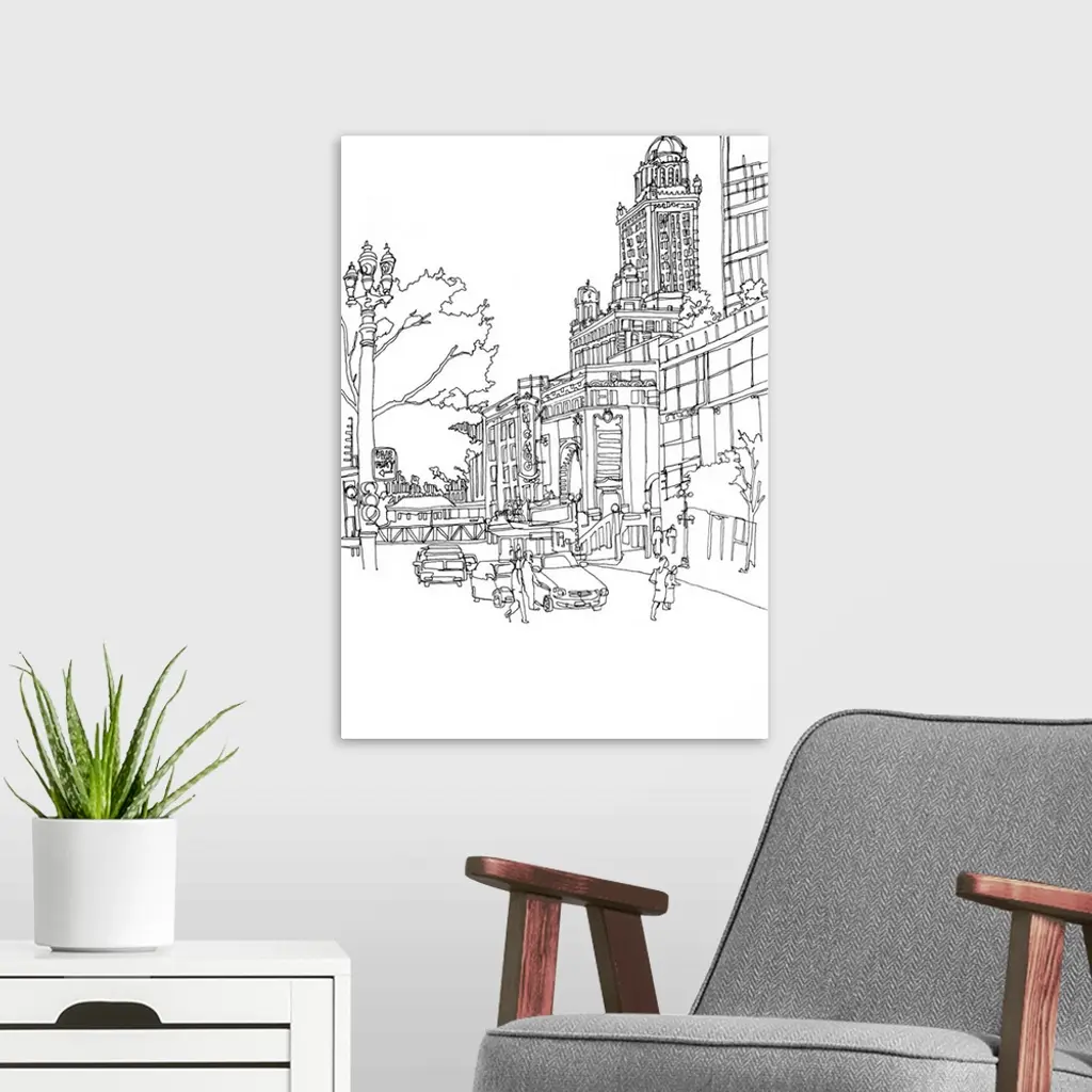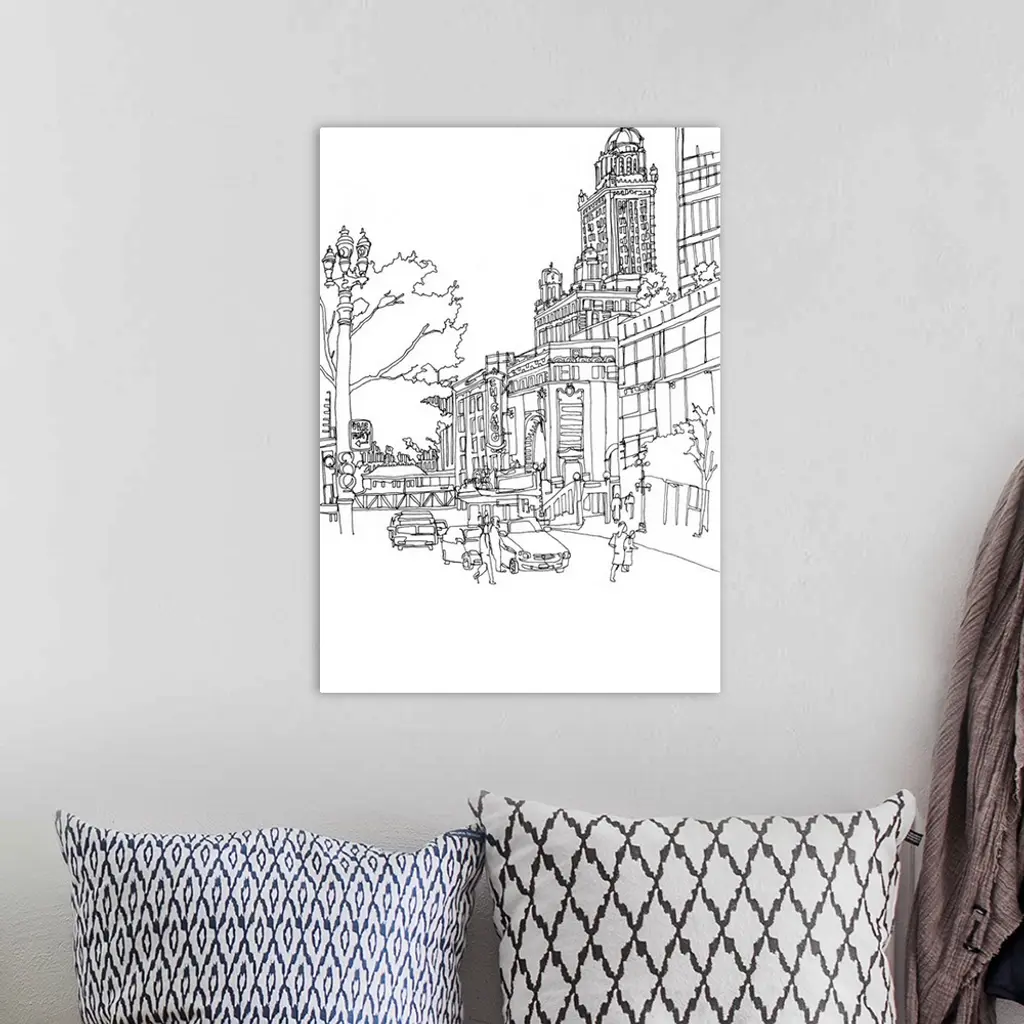 Black and white cityscape illustration of downtown Chicago.