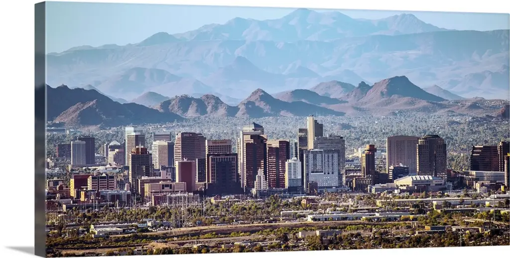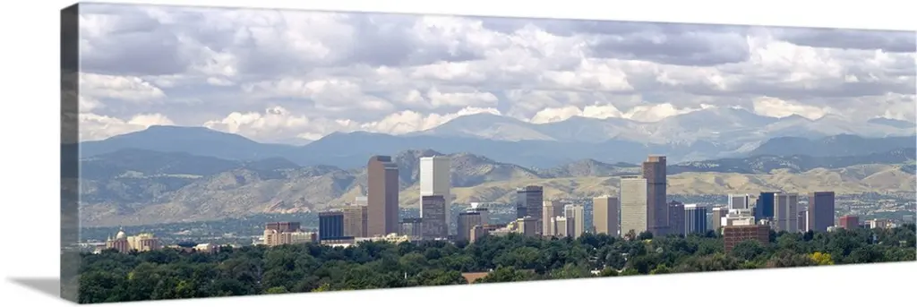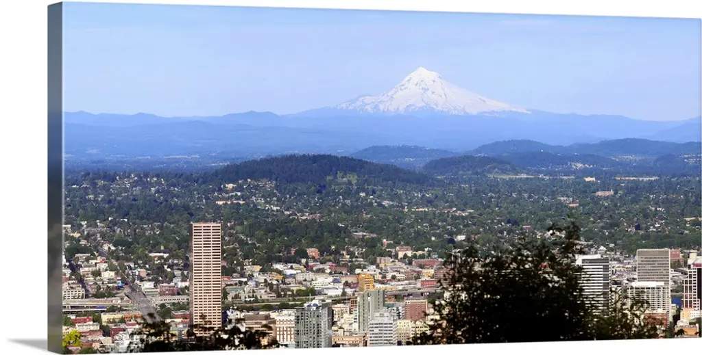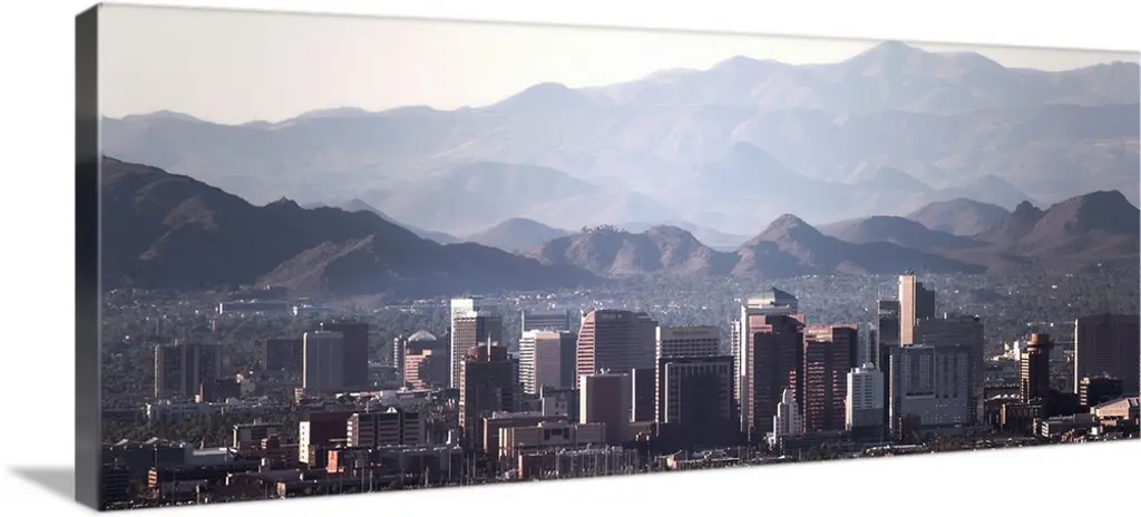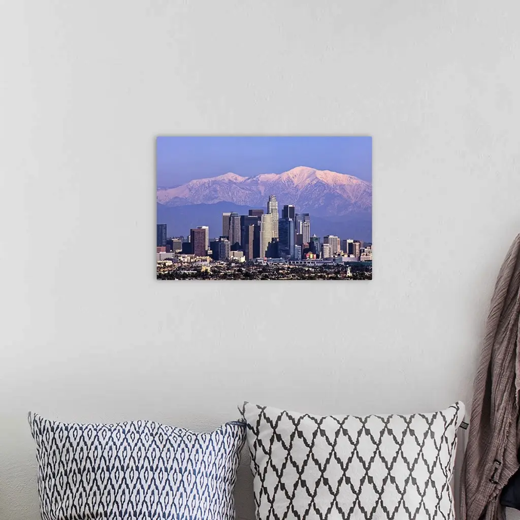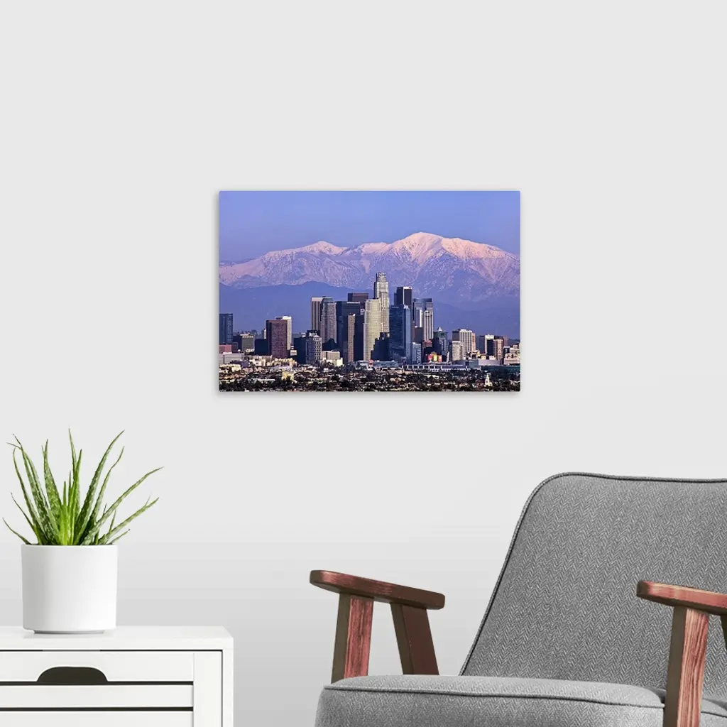 This large piece is a photograph large buildings in Los Angeles with big snow covered mountains in the backdrop.
