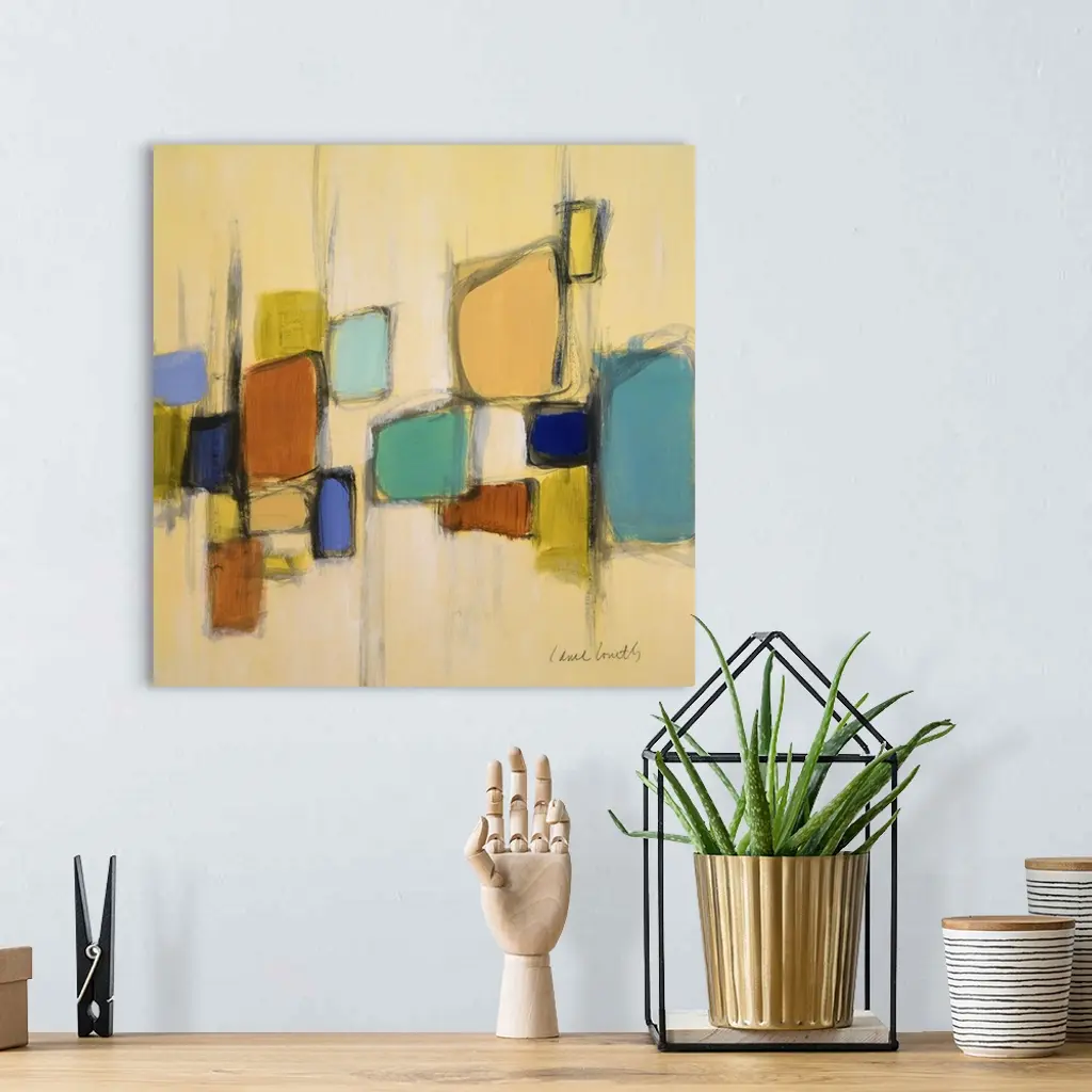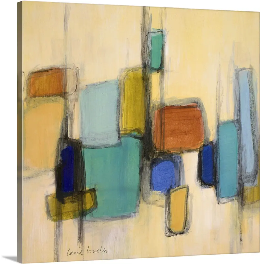 Contemporary abstract art using bold dark lines and colorful geometric shapes against a cream background.