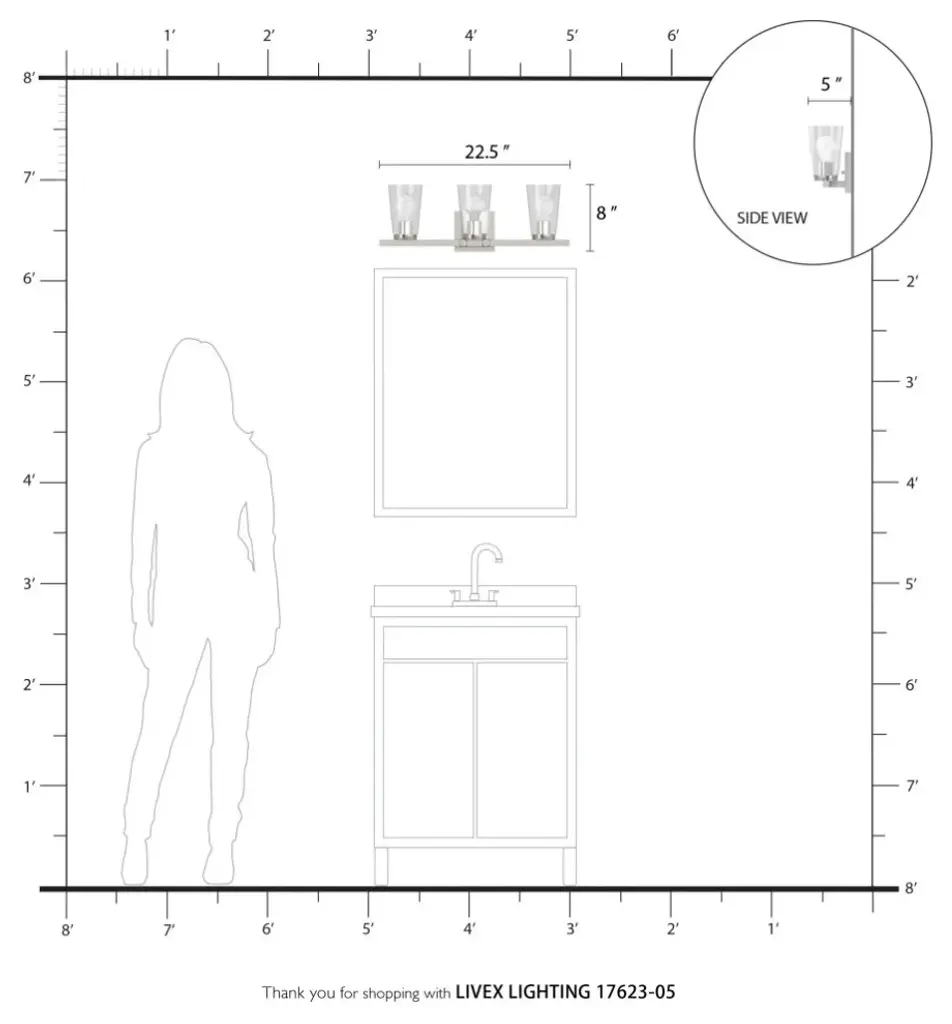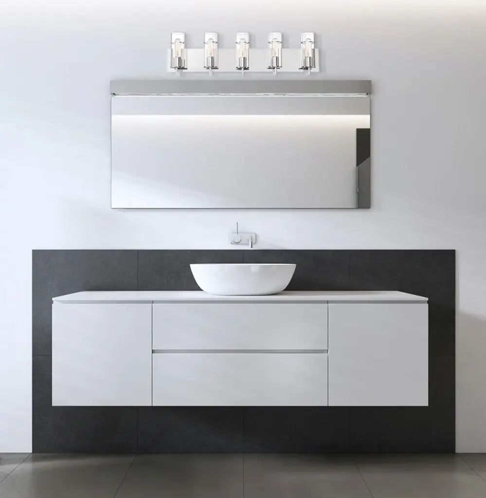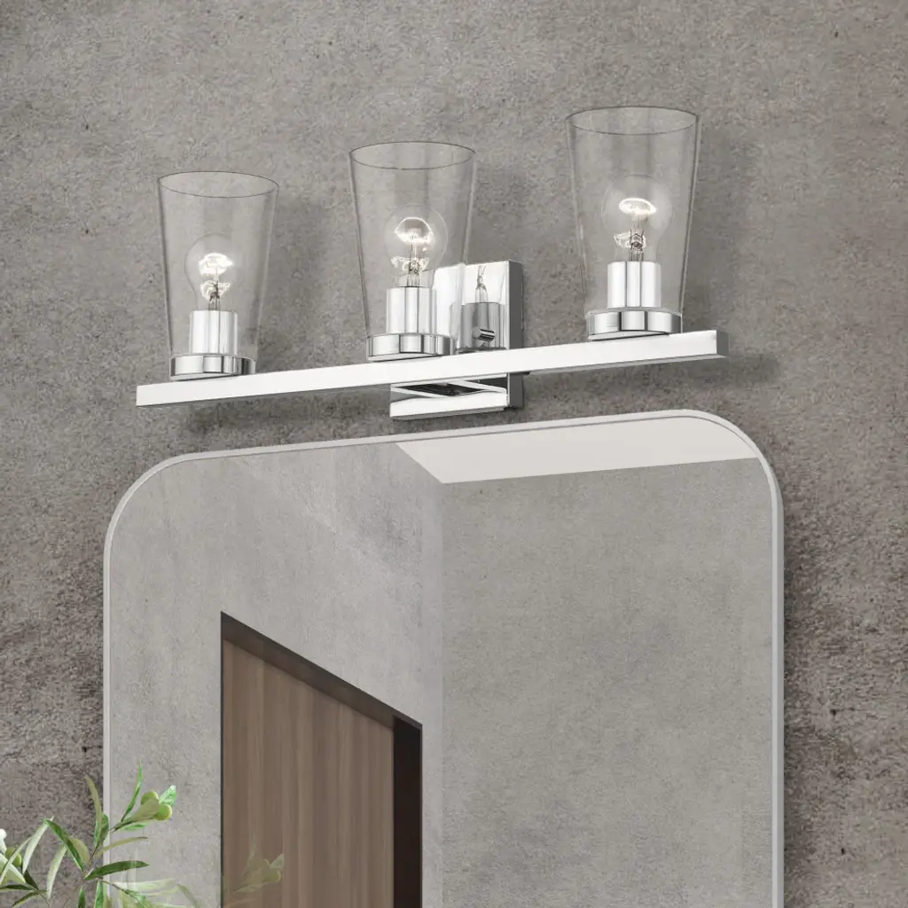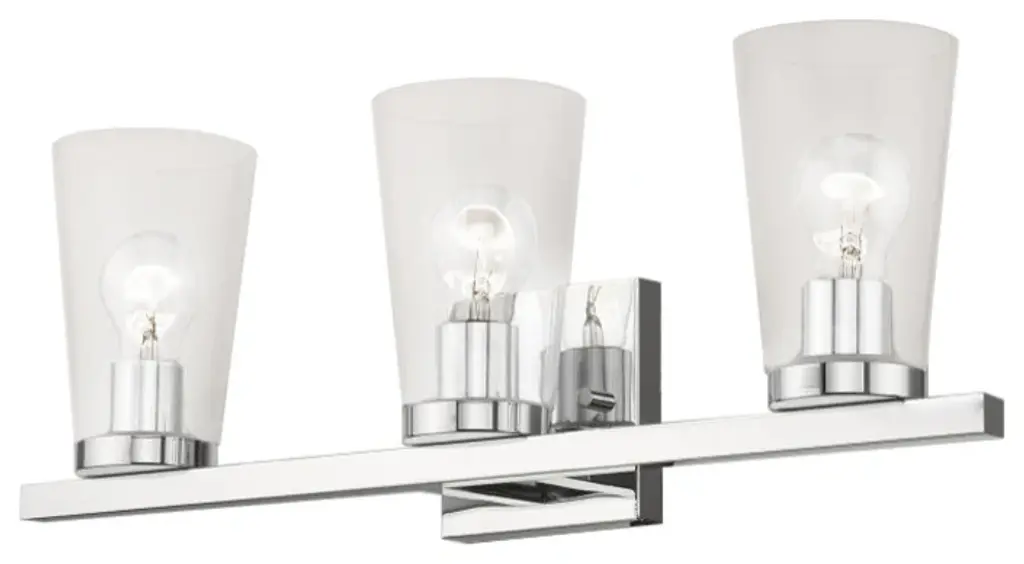 Brighten up your bathroom vanity with the sleek look of the Cityview three light vanity sconce. The tapered clear glass shades and the polished chrome finish make a perfect match.Bulb Wattage: 60Number of Bulbs: 3Type of Bulb: Medium BaseBulbs Included: N