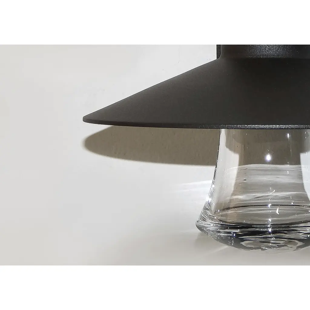 Conical shades finished in Architectural Bronze appear to be suspended by its stainless steel cable. Concealed inside these shades is a high powered COB LED which shines into a heavy Clear glass font. The bottom of theses fonts have an additional thickness of glass for better light distribution and lighting effect.