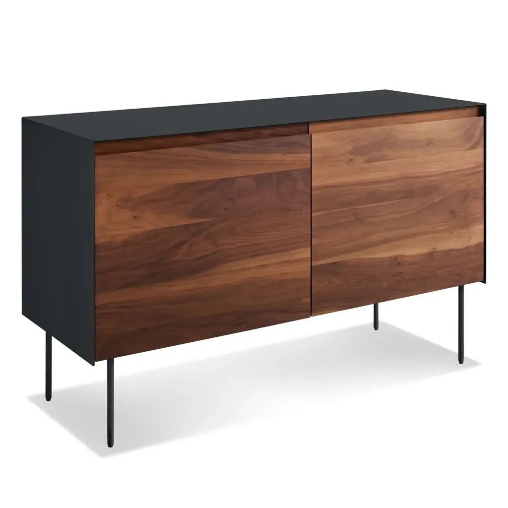 Sometimes we fall hard for a good mix of materials. Like beautiful, warm wood meeting the cool, smooth toughness of steel. This design marries wood doors with a powder-coated steel side, top and legs to form an alluring union. Integrated groove pulls and soft closure mechanisms on all doors.