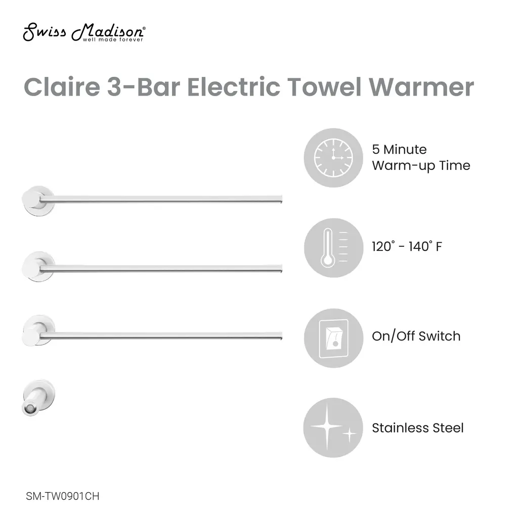 Claire 3-Bar Electric Towel Warmer In Chrome - 19.69" X 40.94" X 4.45" - 19.69" X 40.94" X 4.45" - Chrome