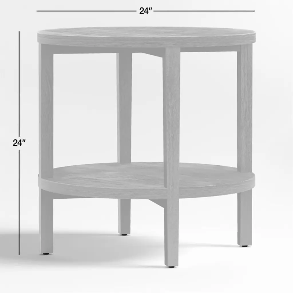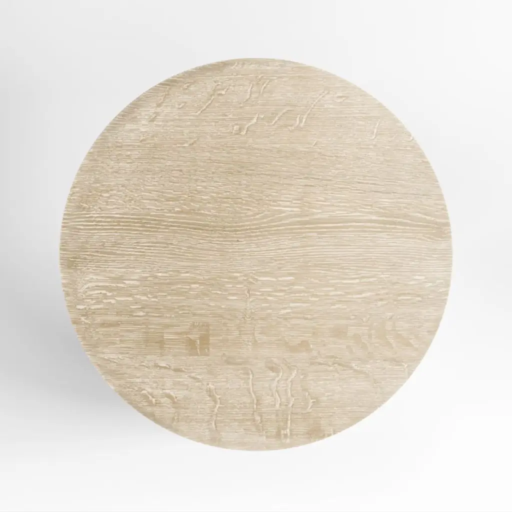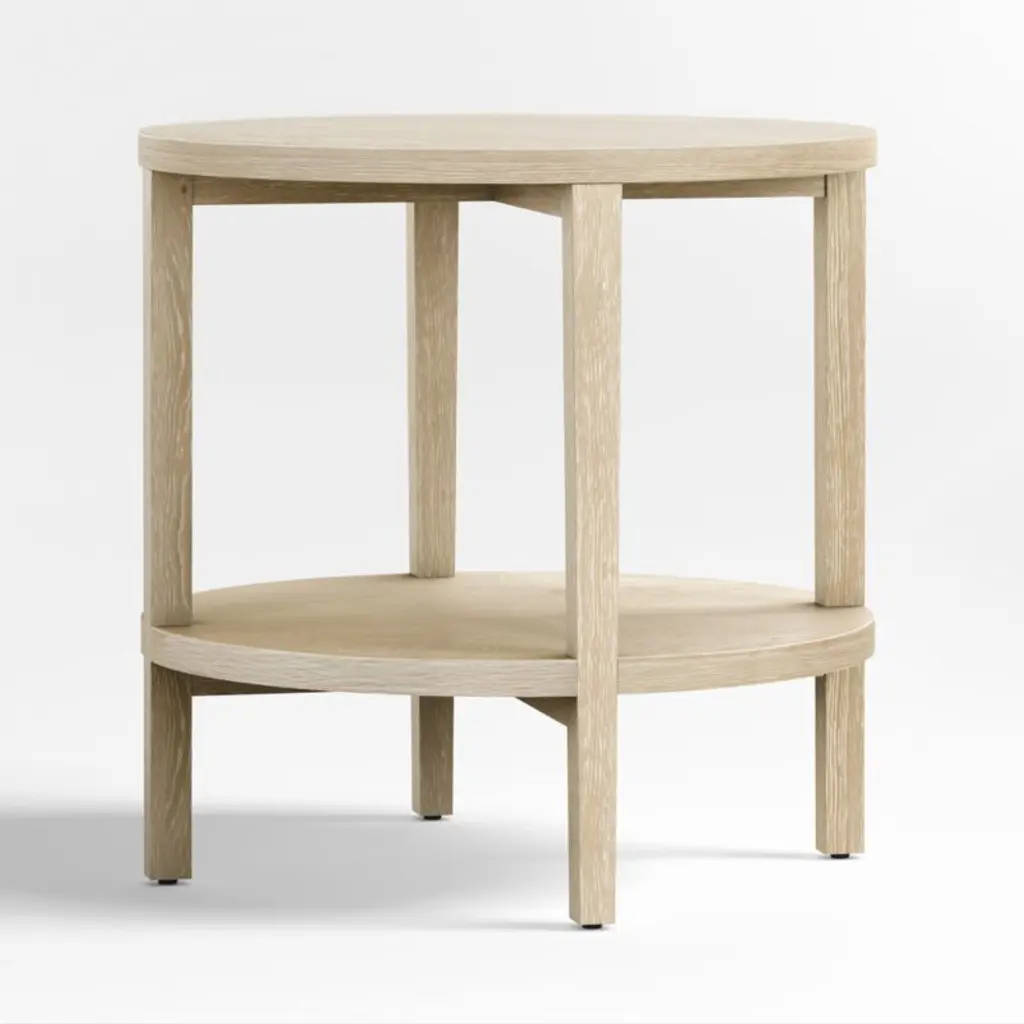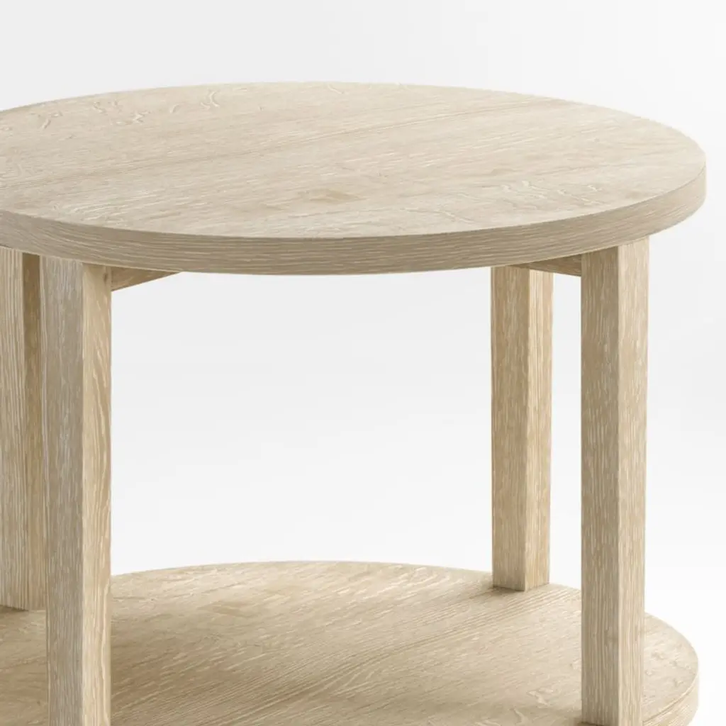 We've translated the refined elegance and Art Deco roots of our popular Clairemont collection into beautifully grained oak. The table's round profile, airy two-tiered design and clean tapered lines are perfect for showcasing the wood's dramatic cathedral graining, brought to full expression with wirebrushing and an ivory ceruse finish. The Clairemont round wood end table is a Crate & Barrel exclusive.By choosing FSC®-certified furniture, you are supporting responsible management of the world's forests.
