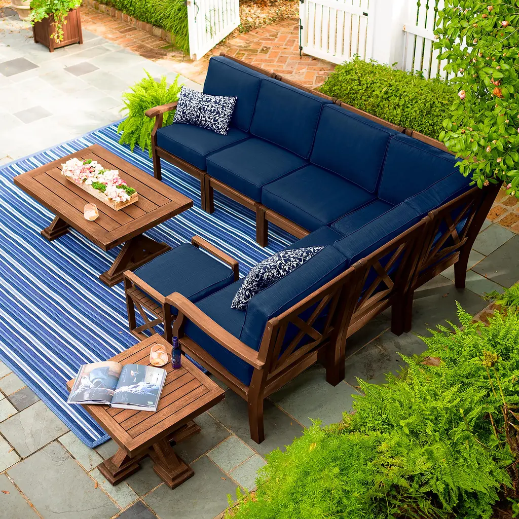 Our Claremont Seating is just what your backyard needs for entertaining. We offer many pieces with lots of possibilities – chairs with arms, without arms and an ottoman. The cross-back design is not only beautiful, but it also provides even support across the back. Thick, comfy polyester cushions are included.Made of eucalyptus, all pieces are sustainable and unique, undergoing extensive oil finishing. Hardware is galvanized steel – an appropriate accent to this rustic collection.Upgrade to a sectional, depending on how large your gatherings get! Use the metal-bracket connectors on the inner parts of the chairs to connect pieces and prevent sliding; corner chair does not feature brackets.