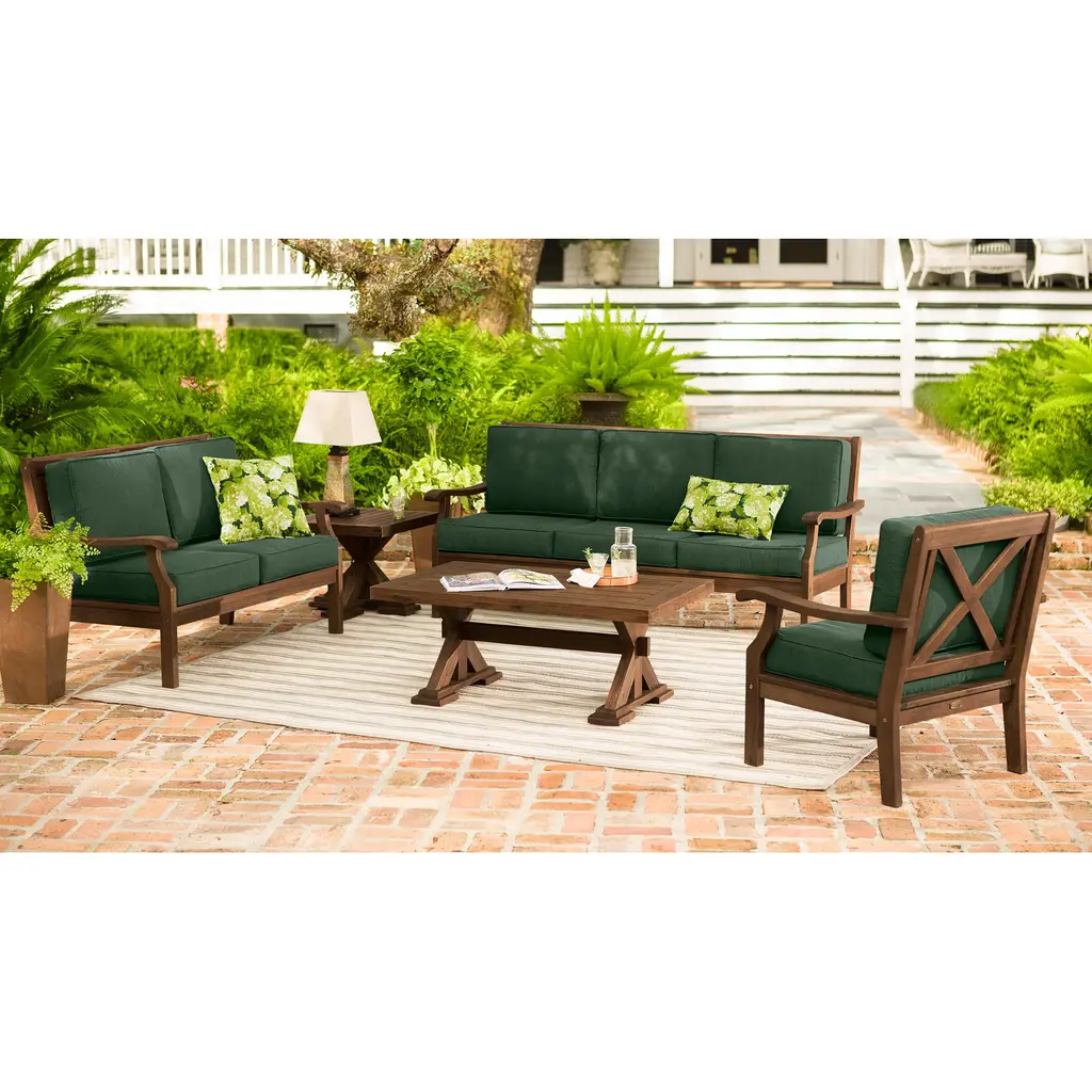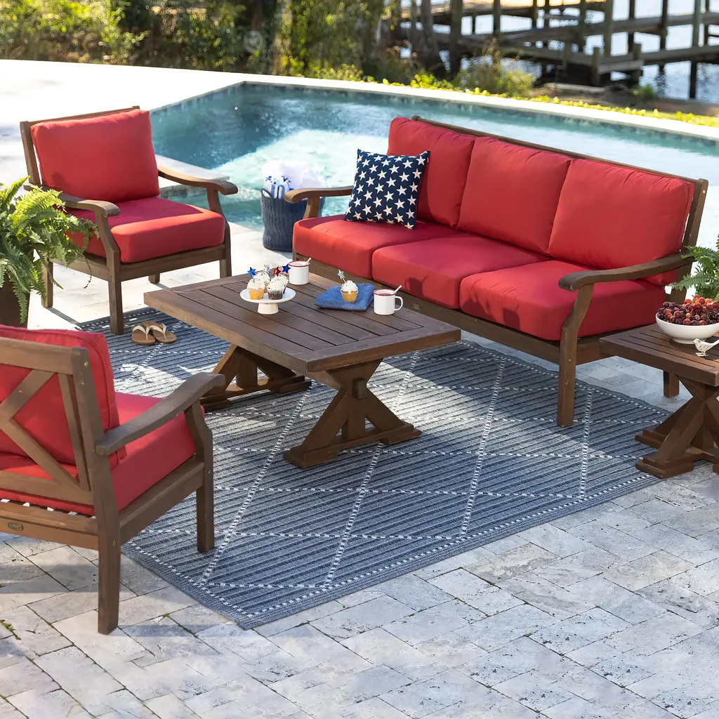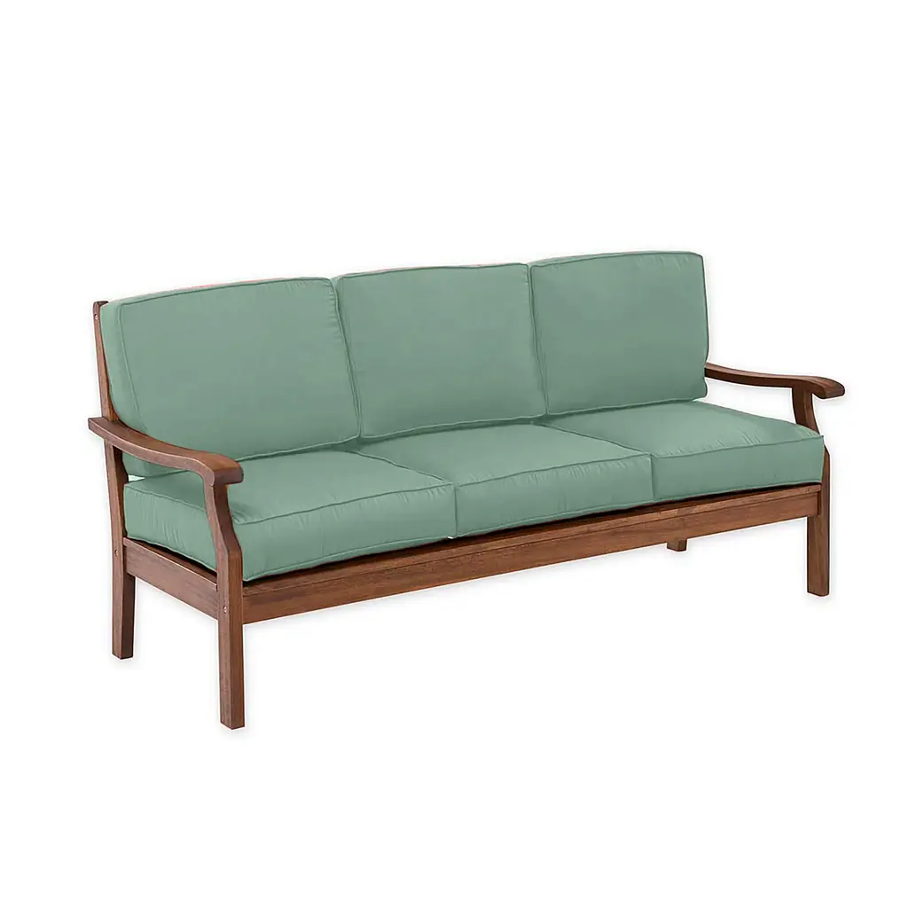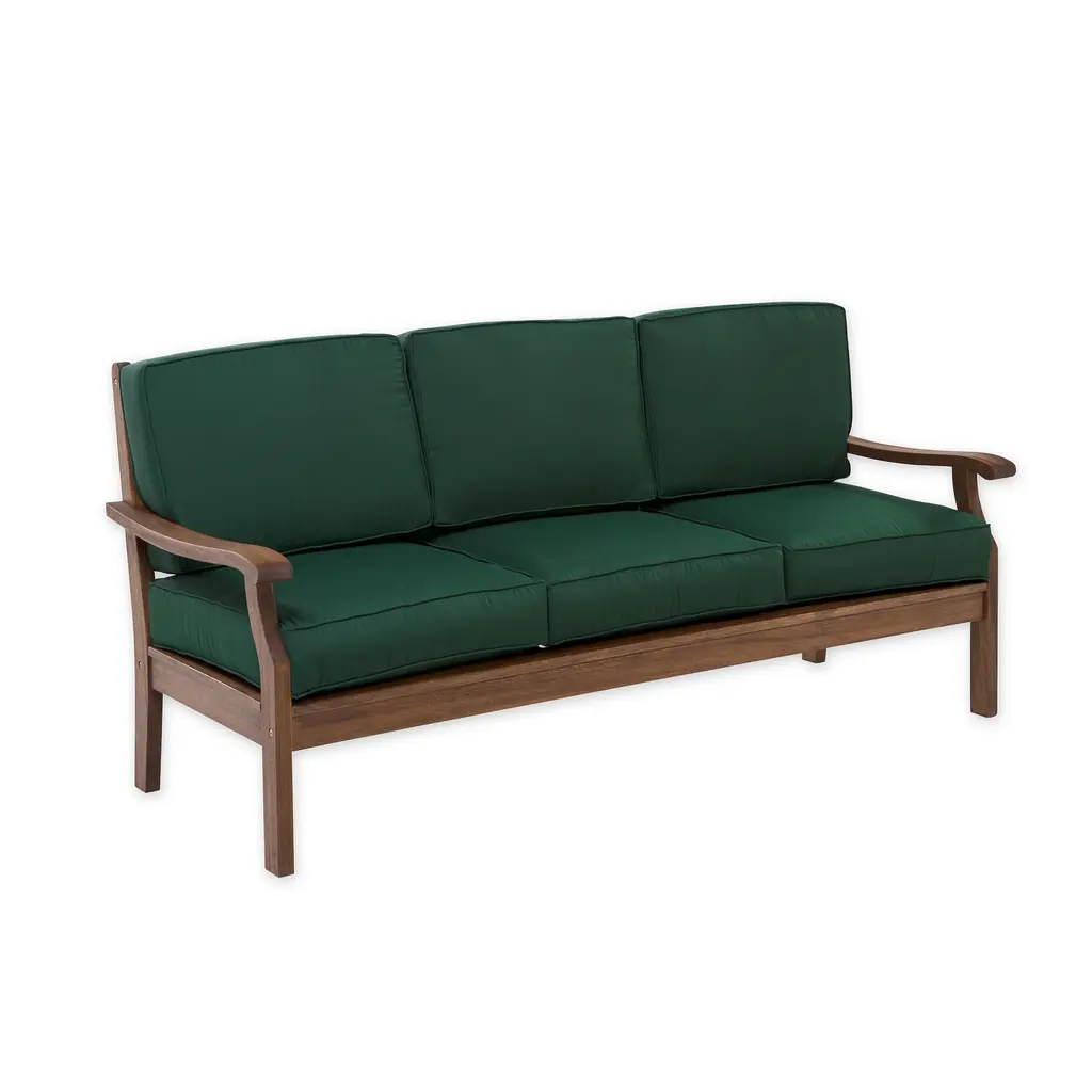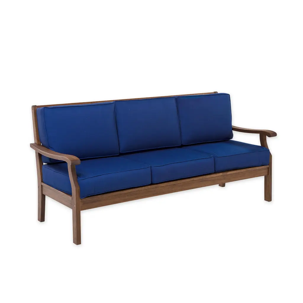 Our deep-seating Claremont Eucalyptus Sofa now features a deeper, richer finish and thicker, tailored cushions. Crafted from FSC-certified eucalyptus grandis, each piece is naturally weather-resistant and insect-repellent. The multi-step finish offers deep, rich color and gorgeous good looks.Sofa features slatted seat with attractive cross-back detailing. Sofa comes with cushions that have a dense foam core with an extra layer of fill for lofty comfort; double welt cording for a finished look. Galvanized steel hardware throughout. For maximum enjoyment and use, off-season storage is recommended. Assembly required. Imported.