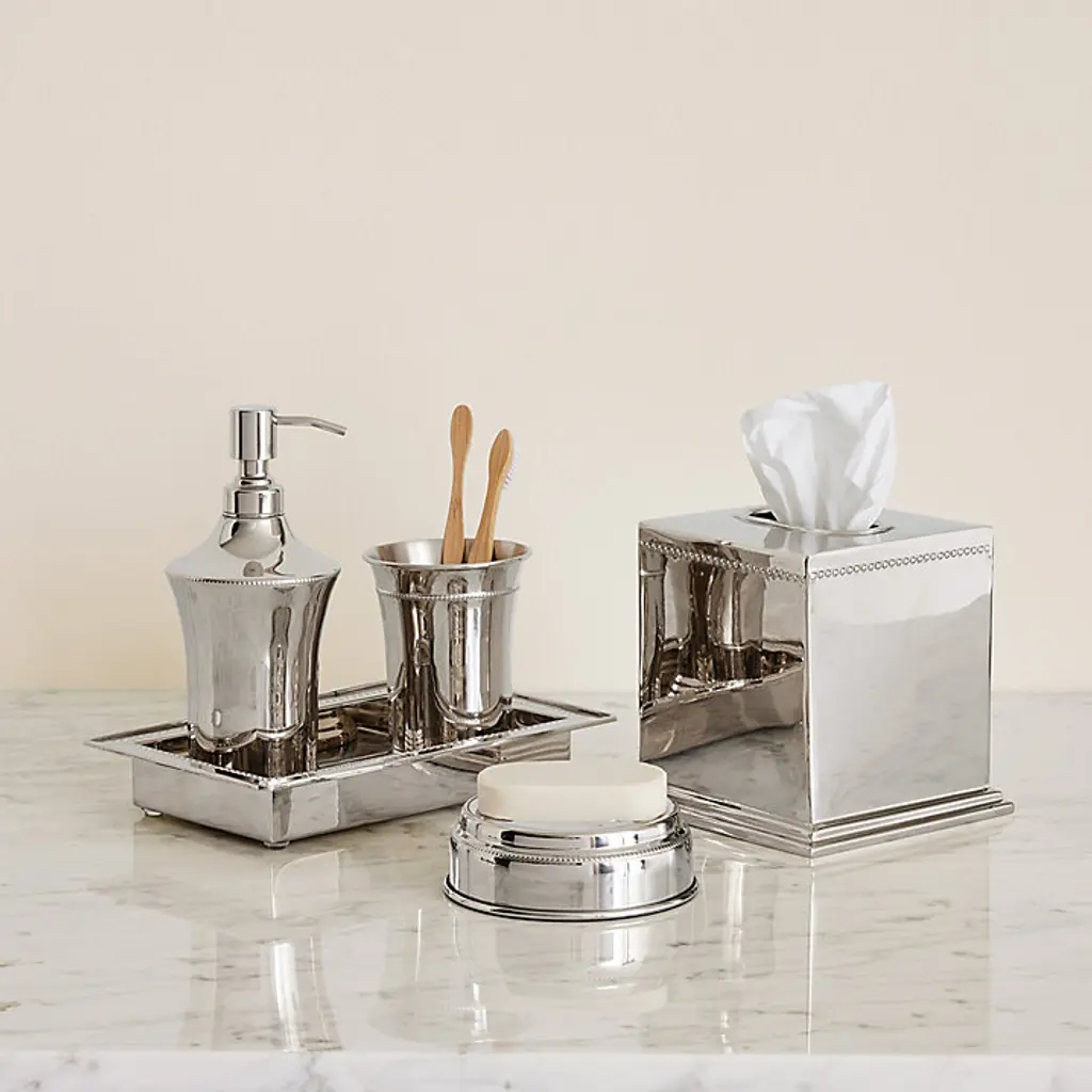 Our Clarrington Bath Collection embodies classic continental style. Inspired by a set of European antiques, each piece in this sleek bathroom accessories collection is beautifully crafted of stainless steel with refined lines, petite bead details, and hand finished in lustrous silver. Several pieces in this elevated bath ensemble also work beautifully as accessories for the home office or bedroom.• Clarrington Bath Collection features:• Lovely hostess & wedding gifts• Silver finishMade of stainless steel• Rust & tarnish-proof• Tissue Box Cover is monogrammable*Allow 2 to 3 weeks for monogramming plus shipping time.*Please note that personalized items are non-returnable.