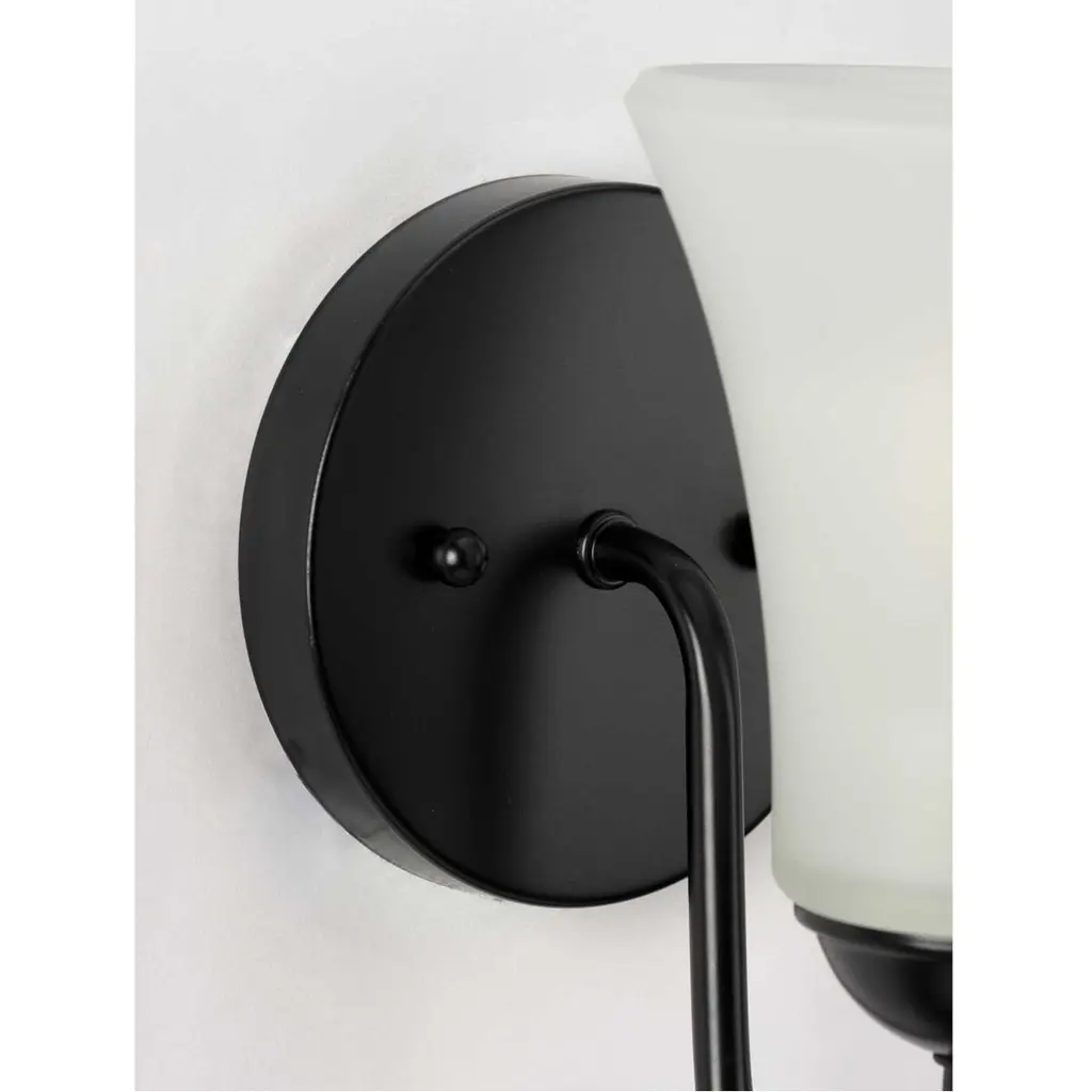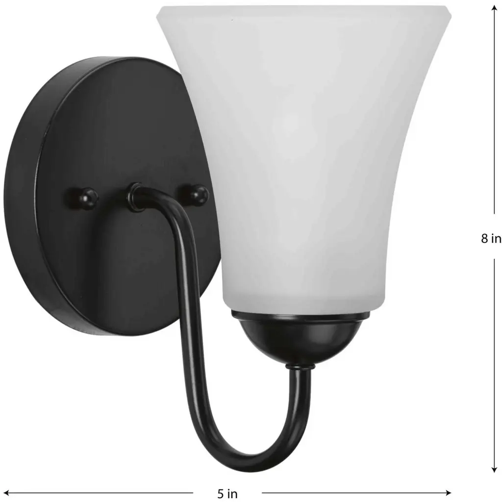 A distinguished, Black-finished circular backplate supports a graceful curved arm as it holds a bell-shaped, etched glass shade. This flawless fixture is perfect for chasing away the shadows around a bathroom mirror, in a dining room or in other living areas craving task light.