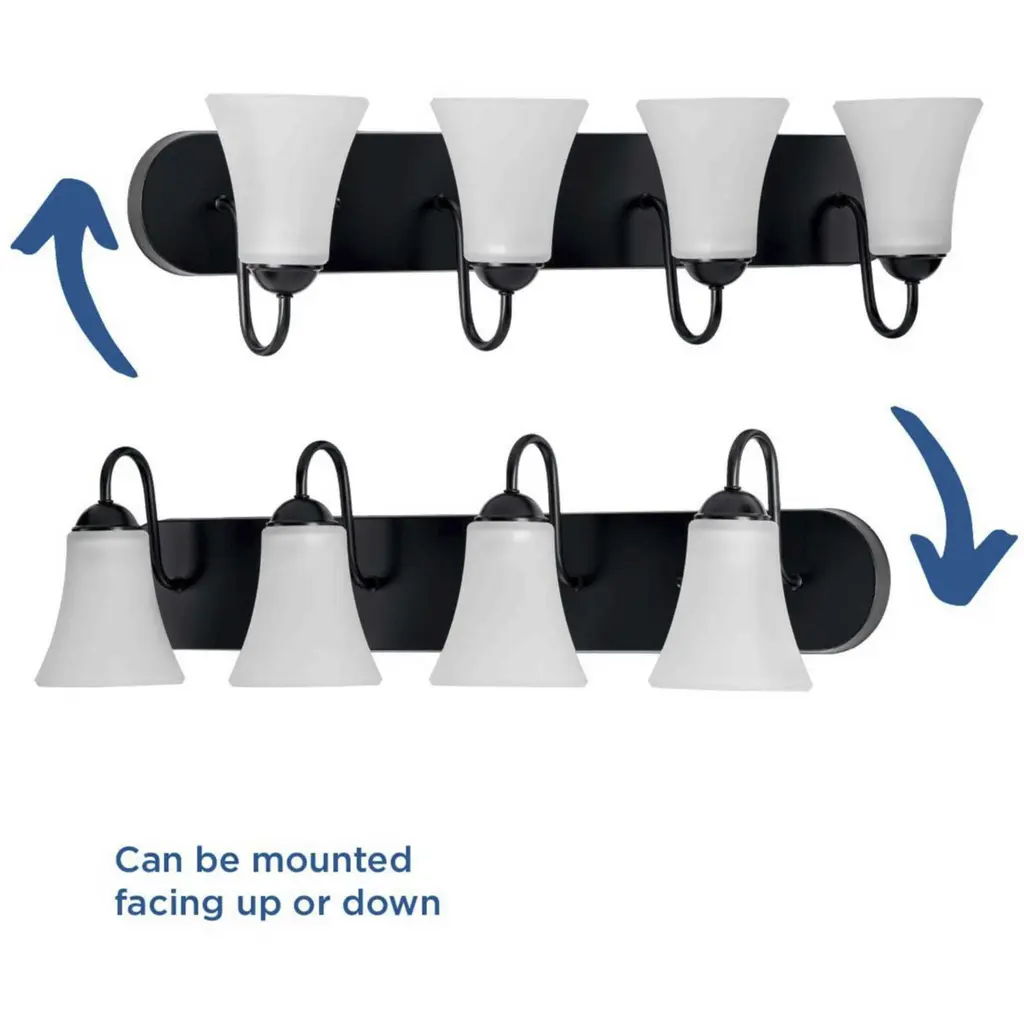 Pay homage to clean, modern-style inspiration with the immaculate design of the Classic four-light bath. A bold, Black backplate supports elegant, curved arms holding the four bell-shaped, etched glass shades. This striking, sophisticated fixture will oust shadows around a bathroom mirror, in a dining room, or wherever focused task light is desired in transitional settings.