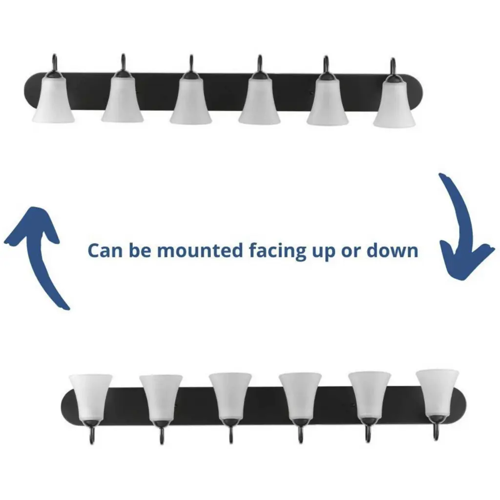 Make a gorgeous, striking impact with the Classic six-light bath. A bold Black backplate serves as a supporting act to the main cast of bell-shaped, etched glass shades accompanied by sleek, curved arms. This epitome of perfection is ideal for bathrooms, dining rooms, or wherever focused task light is desired in transitional settings.