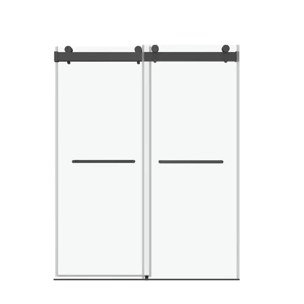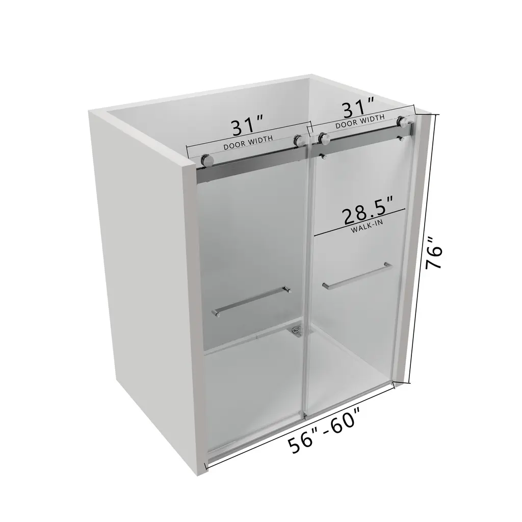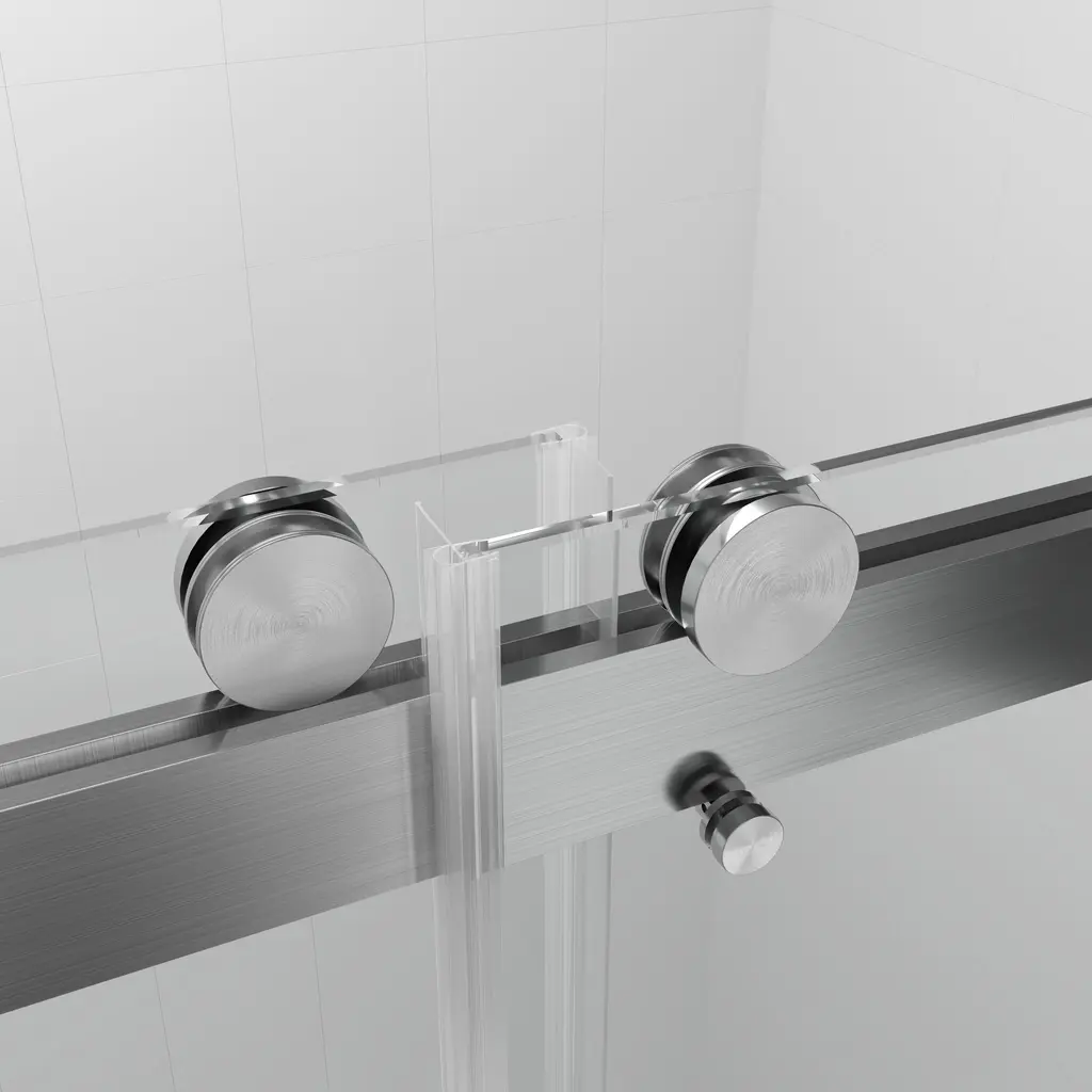 A unique double-slider door system gives life to this adjustable frameless sliding glass shower door. Constructed from ANSI Z97.1 and SGCC (Safety Glazing Certification Council) certified clear easy-cleaning treated tempered glass, this collection is extremely safe and resists dangerous breakage, shards, and unsightly streaks. In addition to being quite sturdy and stable, this shower door has top rail support that ensures wall anchoring and reinforces wall stability. Its damping slide rails are patented and are made of stainless steel, which can bear more than the required weight. Innovative double guide track with patent technology, and build in Anti-jumping Device greatly eliminates the gap between the pulley and the track and also makes the doors easy to push and pull. Besides, we offer full-length clear seal strips for sliding door panels and a bottom metal water deflector to redirect water within the shower space. Finally, all the hardware on this shower door is plated in premium finish to safeguard against rust, corrosion, and resistance, making it a piece that will stay in your home for years down the line. With stylish appearance and deluxe and delicate hardware, this collection is ready for your home today! FEATURES: