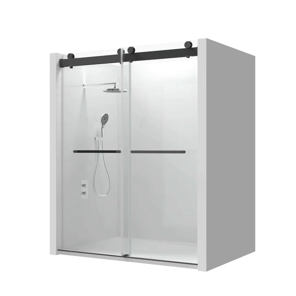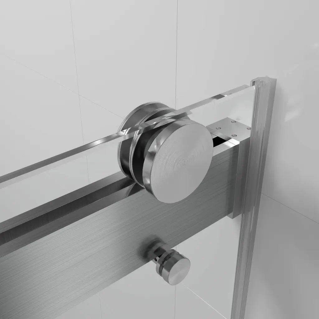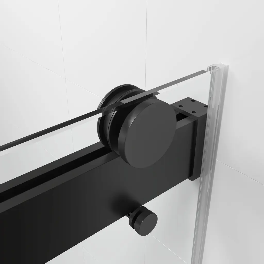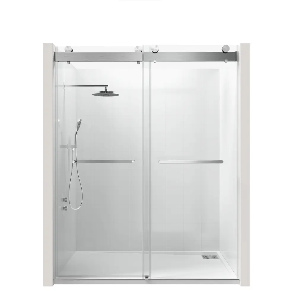 A unique double-slider door system gives life to this adjustable frameless sliding glass shower door. Constructed from ANSI Z97.1 and SGCC (Safety Glazing Certification Council) certified clear easy-cleaning treated tempered glass, this collection is extremely safe and resists dangerous breakage, shards, and unsightly streaks. In addition to being quite sturdy and stable, this shower door has top rail support that ensures wall anchoring and reinforces wall stability. Its damping slide rails are patented and are made of stainless steel, which can bear more than the required weight. Innovative double guide track with patent technology, and build in Anti-jumping Device greatly eliminates the gap between the pulley and the track and also makes the doors easy to push and pull. Besides, we offer full-length clear seal strips for sliding door panels and a bottom metal water deflector to redirect water within the shower space. Finally, all the hardware on this shower door is plated in premium finish to safeguard against rust, corrosion, and resistance, making it a piece that will stay in your home for years down the line. With stylish appearance and deluxe and delicate hardware, this collection is ready for your home today! FEATURES: