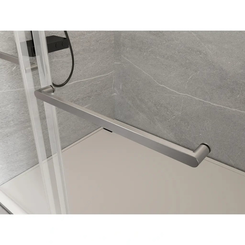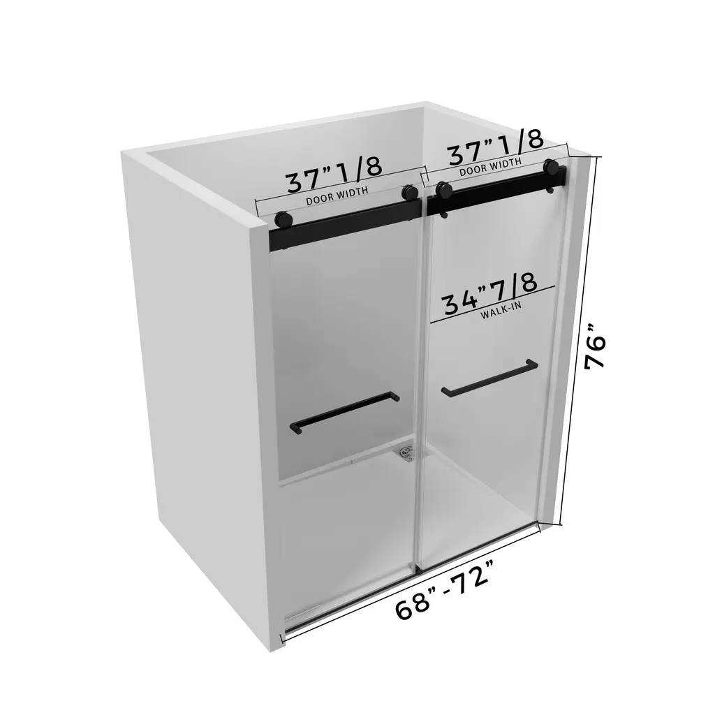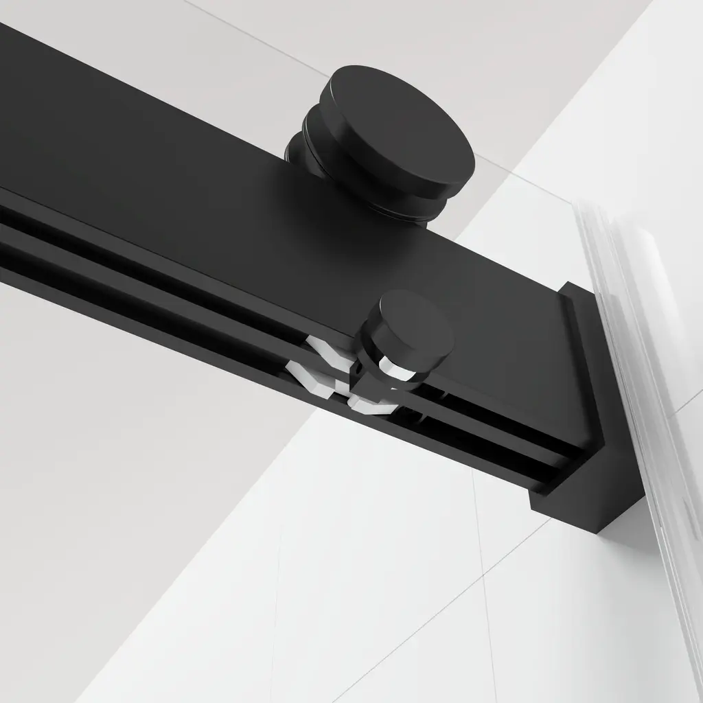 A unique double-slider door system gives life to this adjustable frameless sliding glass shower door. Constructed from ANSI Z97.1 and SGCC (Safety Glazing Certification Council) certified clear easy-cleaning treated tempered glass, this collection is extremely safe and resists dangerous breakage, shards, and unsightly streaks. In addition to being quite sturdy and stable, this shower door has top rail support that ensures wall anchoring and reinforces wall stability. Its damping slide rails are patented and are made of stainless steel, which can bear more than the required weight. Innovative double guide track with patent technology, and build in Anti-jumping Device greatly eliminates the gap between the pulley and the track and also makes the doors easy to push and pull. Besides, we offer full-length clear seal strips for sliding door panels and a bottom metal water deflector to redirect water within the shower space. Finally, all the hardware on this shower door is plated in premium finish to safeguard against rust, corrosion, and resistance, making it a piece that will stay in your home for years down the line. With stylish appearance and deluxe and delicate hardware, this collection is ready for your home today! FEATURES: