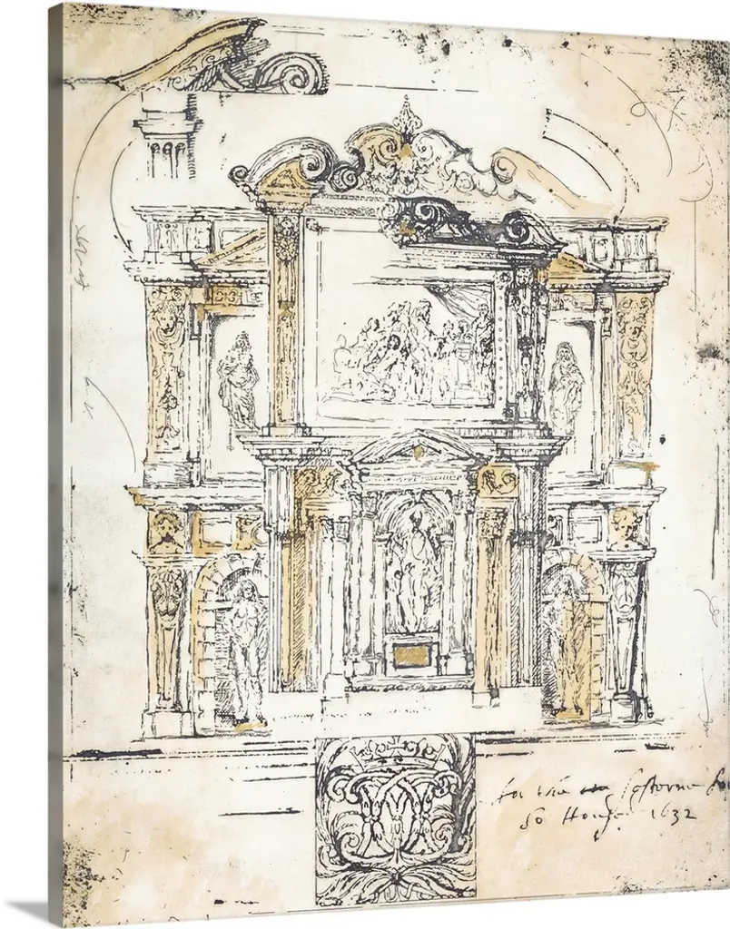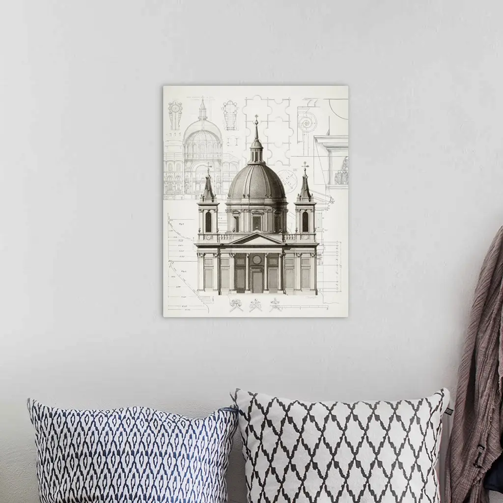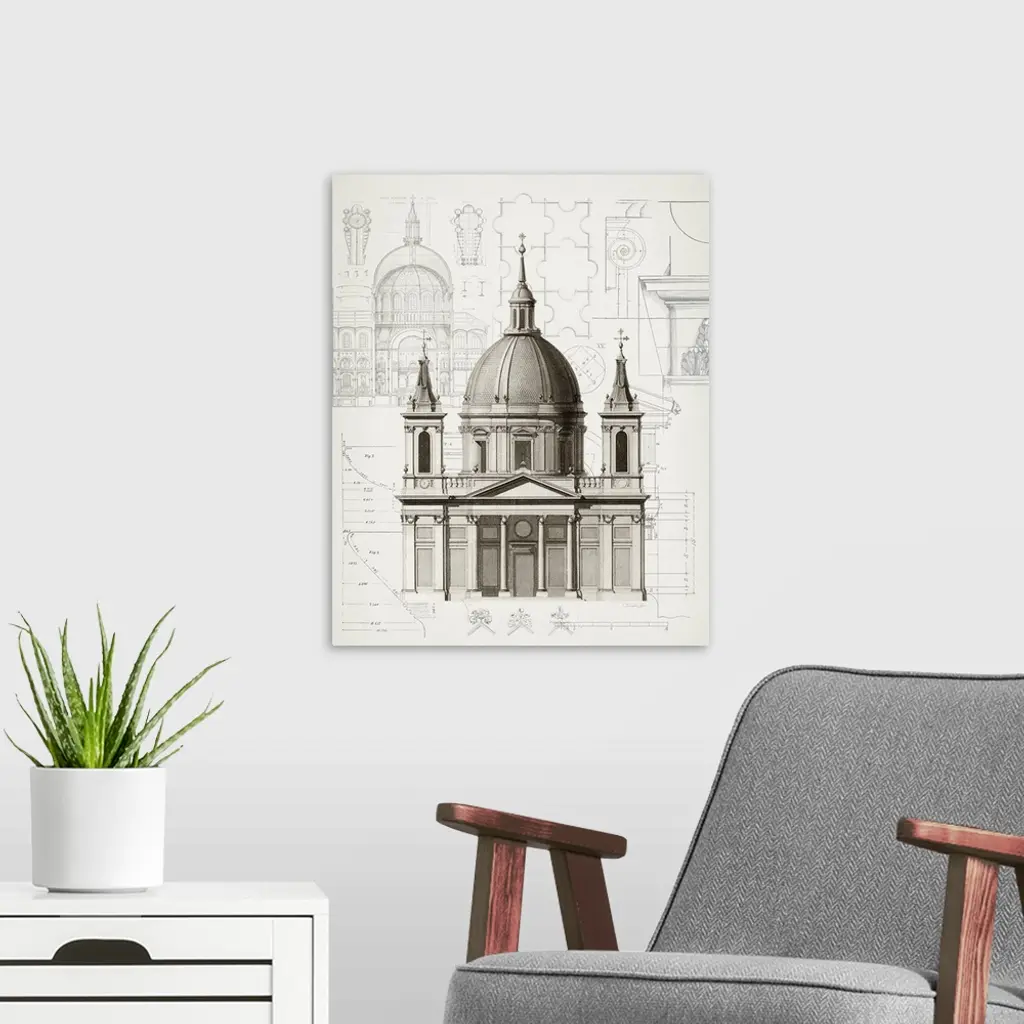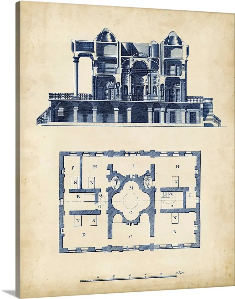 Black and white architectural illustration and blueprint with numbered measurements in the background.