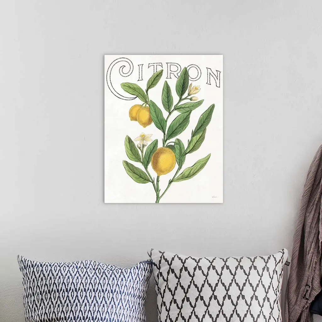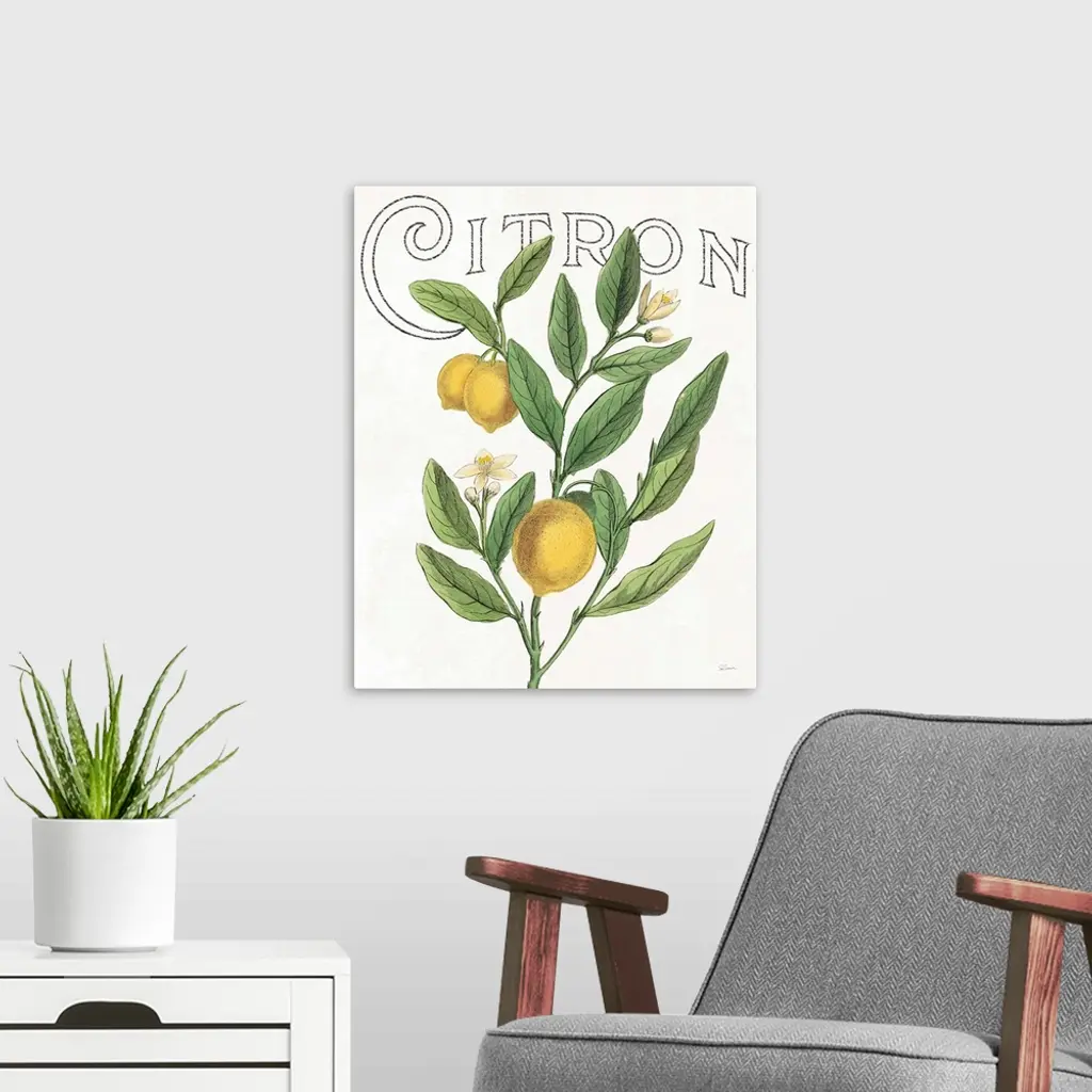 Illustration of lemons, leaves, and flowers with "Citron" written at the top on a white background.