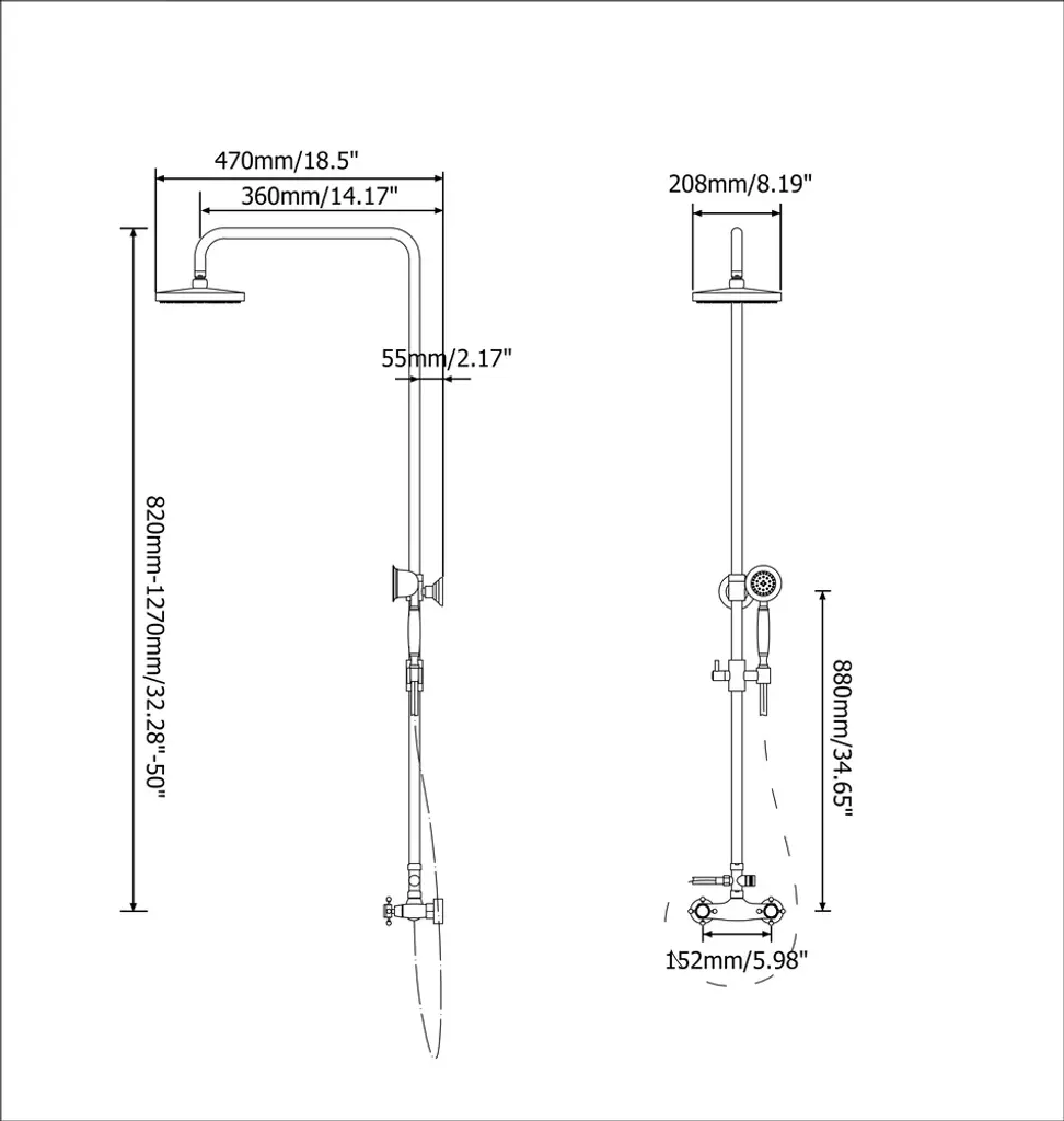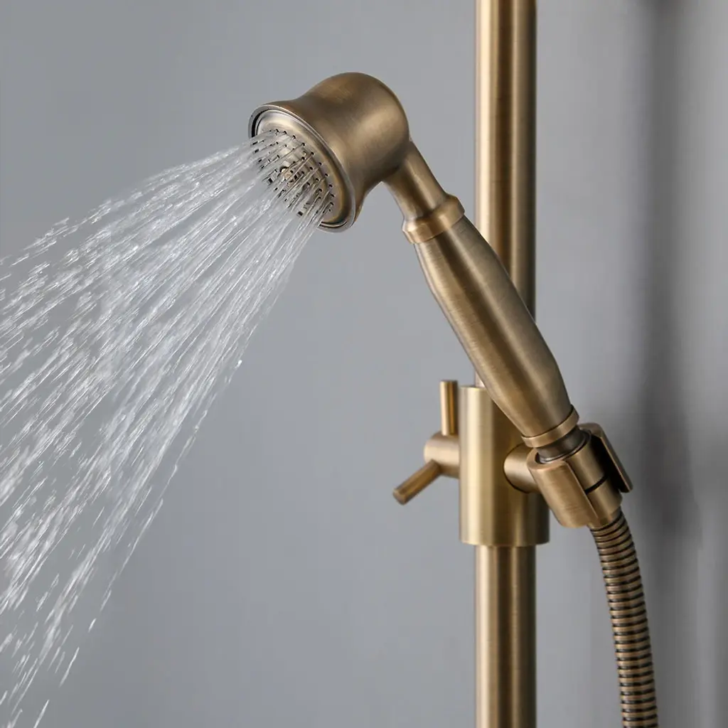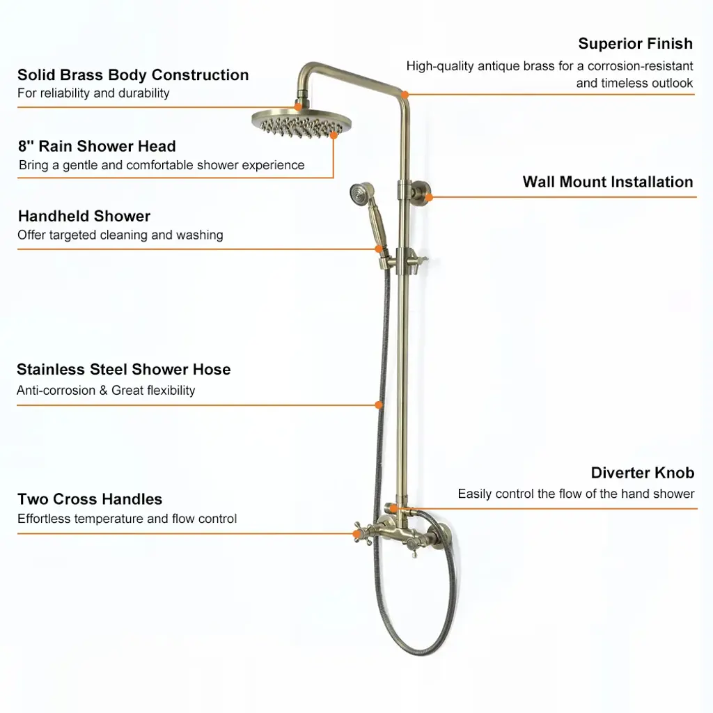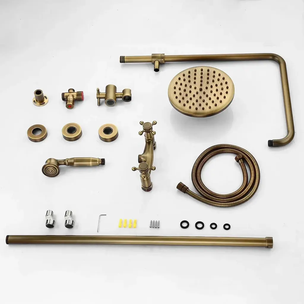 Update your bathroom decor with this traditional style shower package giving the home a timeless and beautiful look. Featuring double cross handles to enhance its classic style, this shower system also comes with a sleek, round showerhead, which sends strong rain-like flowing water and gives you an extraordinary shower experience. The stunning, distinctive antique brass finish and solid brass construction achieve a coordinated look, offering a complete set to enhance your bathroom style.