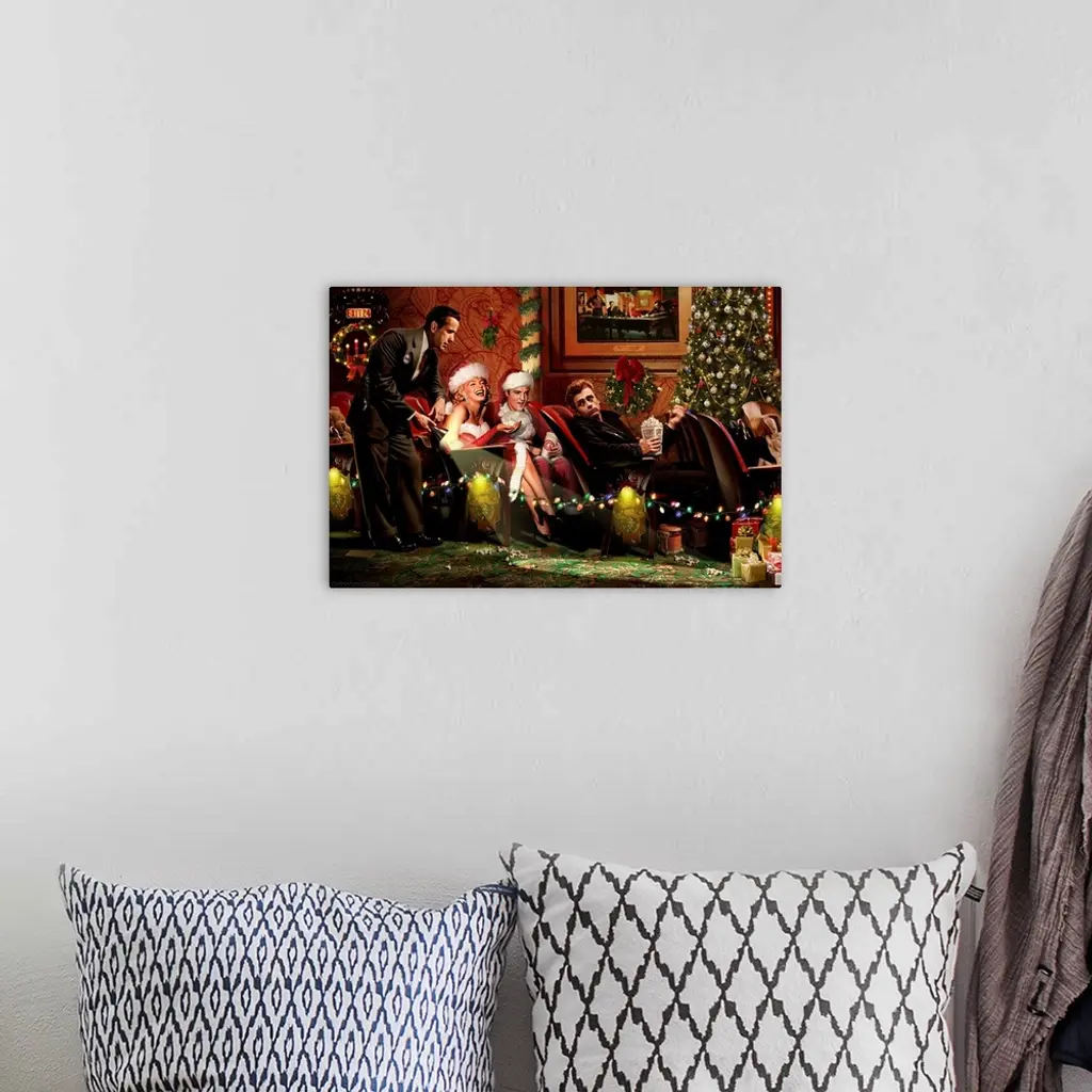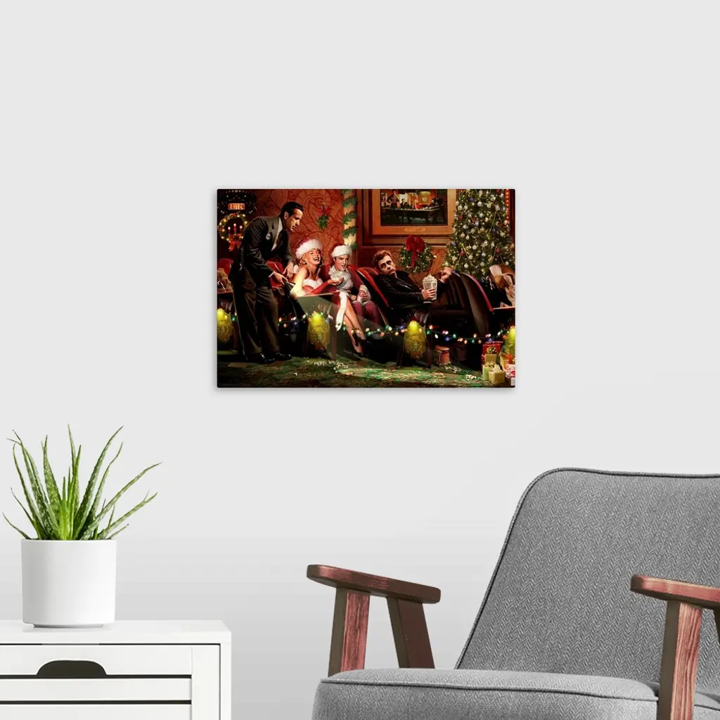 Chris Consani lends dark allure and masculine perspective to movie fantasy settings, showcasing iconic celebrities like Marilyn Monroe, Elvis, James Dean and Bogart at a movie theater.