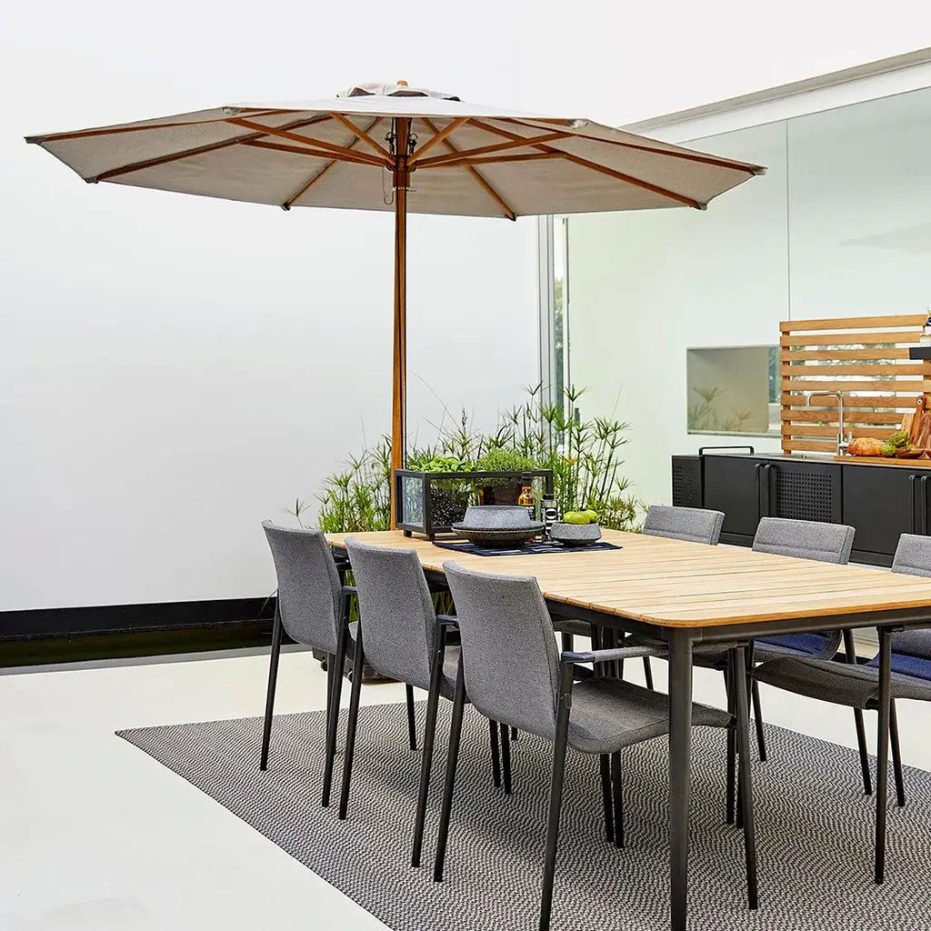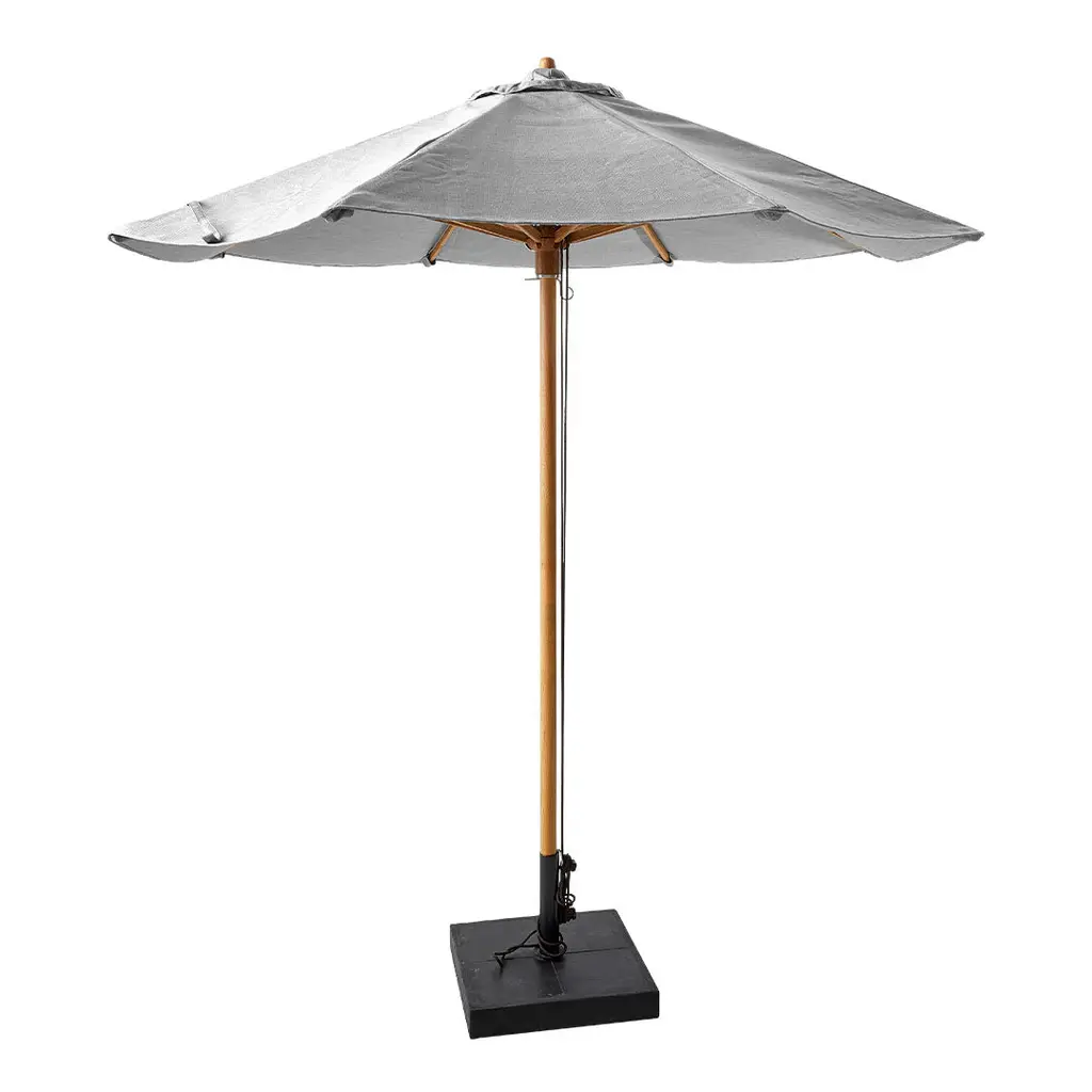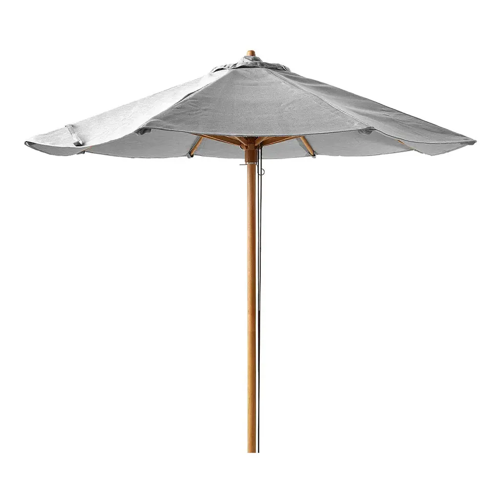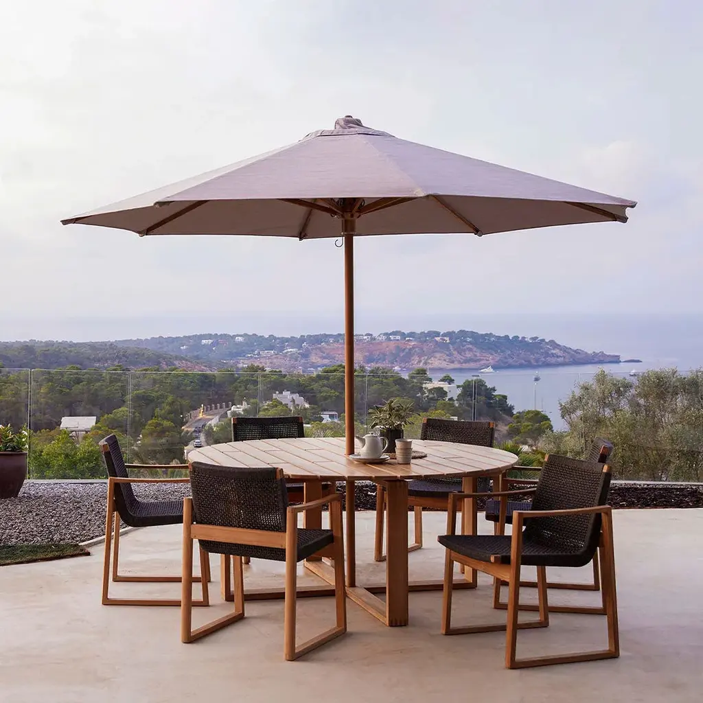 As the name of the range expresses, the parasol is created with a focus on a classic and timeless design that fits into any decor in your outdoor environment. Classic comes in different sizes, which can both be matched to the cosy outdoor lounge area with togetherness in the shade, or as a necessary addition to the outdoor dining set, so the area can be enjoyed even when the sun is at its highest. The classic parasol is made from certified teak wood, where the elegant teak slats form a beautiful web of warm wood on the inside of the parasol when it is erected. The fabric of the parasol is the durable Solution dyed 280gr/m2, which ensures a weather resistant parasol cloth, which is also resistant to UV rays. In all, a lasting and classical parasol with a long life.