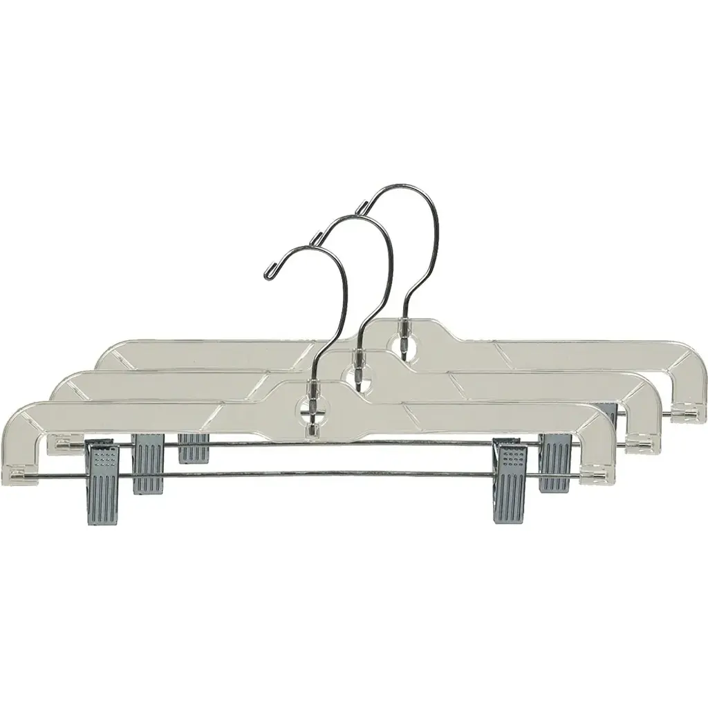 Ensure your skirts and slacks are wrinkle free with this classic metal-and-plastic hanger. The polished chrome swivel hook rotates smoothly for fuss-free hanging, and the polished chrome pinch grips feature clear anti-stain cushions that hold your bottoms and strapless clothes firmly in place without damaging them. Materials: Plastic, Metal Dimensions: 0.44 inches Wide x 14 inches Long x 6.5 inches Tall