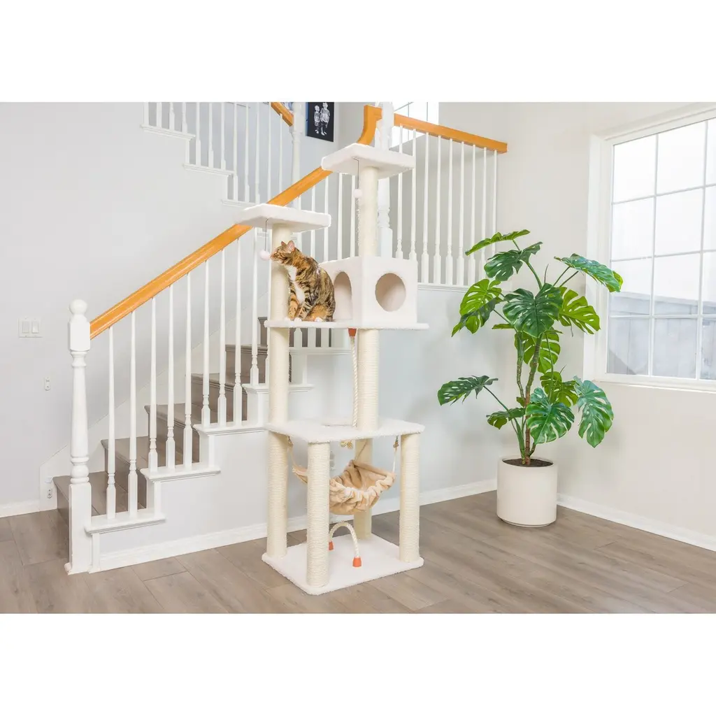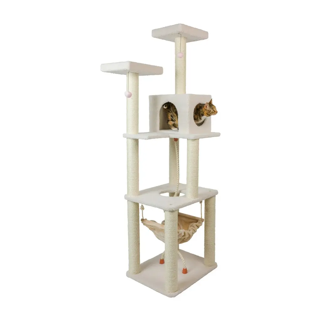 Classic Real Wood Cat Tree In Ivory, Four Levels With Rope Swing - Ivory - Ivory