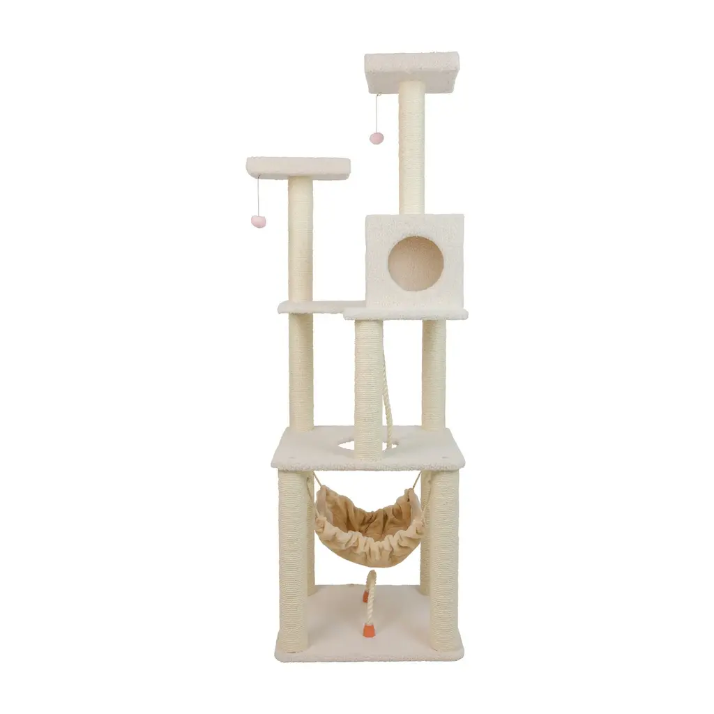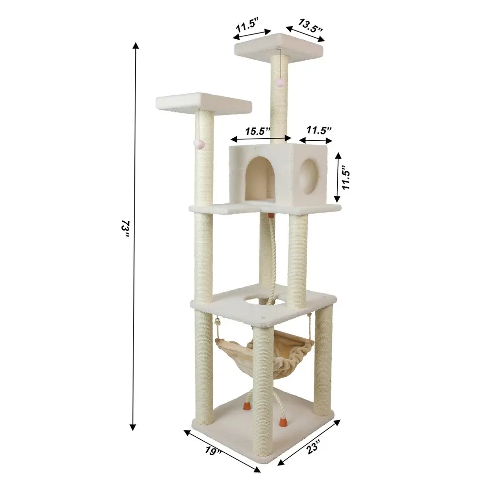 Description: Treat your cats and kittens to the Classic cat tree. Cat Daddy Approved by noted cat behaviorist Jackson Galaxy, this ivory cat tree has four levels, along with a rope swing, hammock, condo, and perch. It is perfect for cat to sit and observe their surroundings. F and B Bullet: Multi-function Cat Tower in ivory faux fleece, coverings are permanently adhered to wood structures, easy to clean and goes with furniture. Well constructed of 15mm pressed wood material, making it not only thicker but stronger and keep it in shape. 100% natural, seasoned sisal rope wraps all posts securely for years of "scratch.". Dimensions: Base Dimensions:24" x 20"; Condo Dimensions:16"(L) x 12"(W) x 12"(H); Perch Dimensions:14" x 12". Post Diameter: 3.5". Maximum Holding Weight: 60 lbs. Product Size: Overall Dimensions: 27"(L)X24"(W)X73"(H) What in Included: Hardware set, Instruction, cat tree Fabric Care: Spot clean Color: Ivory
