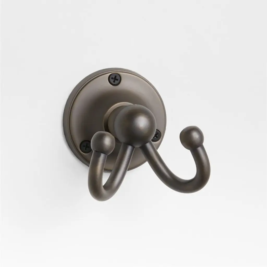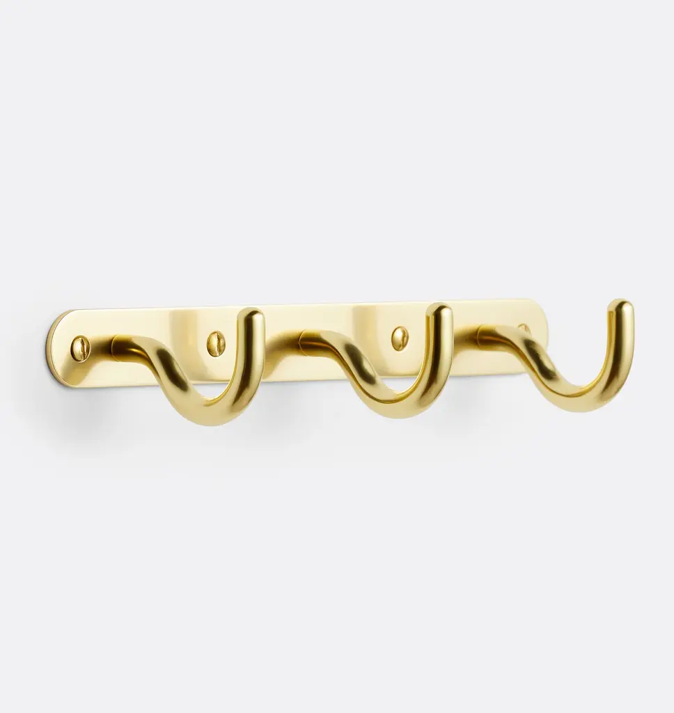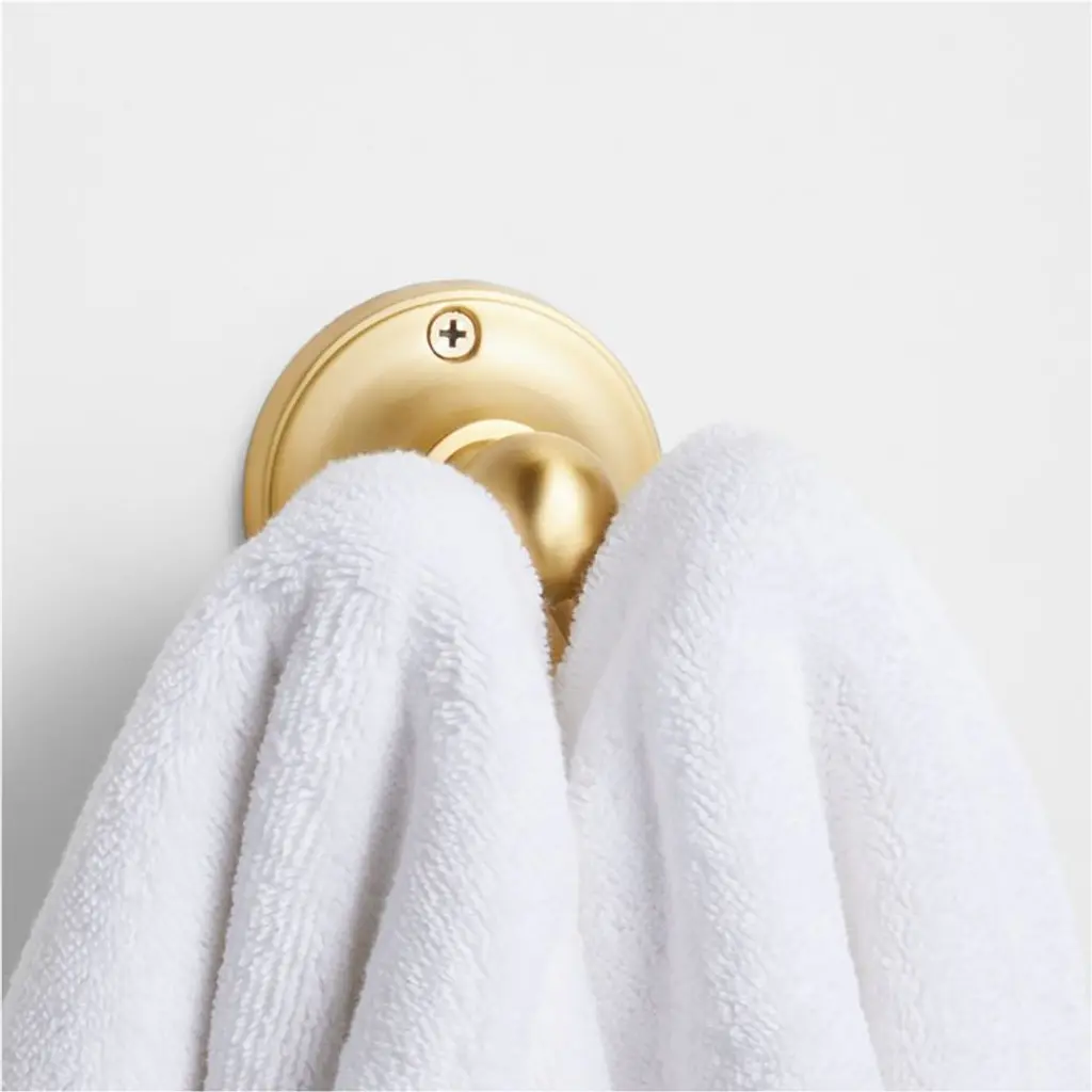 Sometimes it's the small things that pull a room together. That's why we've designed a hardware collection with modern silhouettes, clean lines and a touch of tradition to give your bathroom that perfect finishing touch. We named this towel hook Classic for a reasonanchored on a round rosette base, two hooks curve into ball finials for a timeless look. Crafted of brass with a gleaming brushed finish, the double hook has smooth edges and a slim profile. Hardware is included to make it easy to refresh the look of your powder room or bathroom.