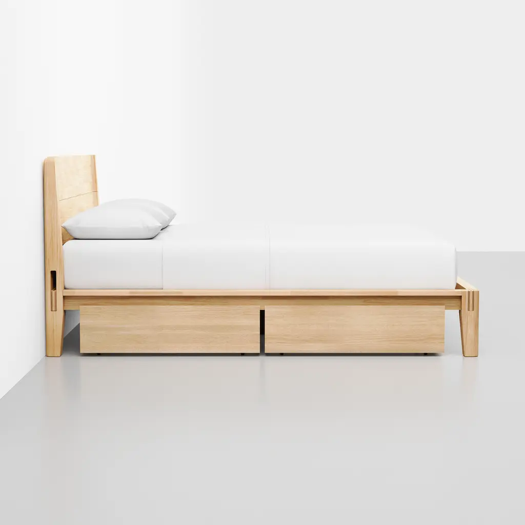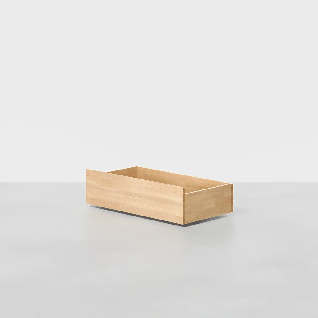 Integrated and intuitive underbed storage as a clean continuation of the Classic Bed’s minimalism. Crafted from solid wood with an overlapping drawer face. Hidden caster wheels provide a smooth experience for daily access. Available as a single unit or a pair.