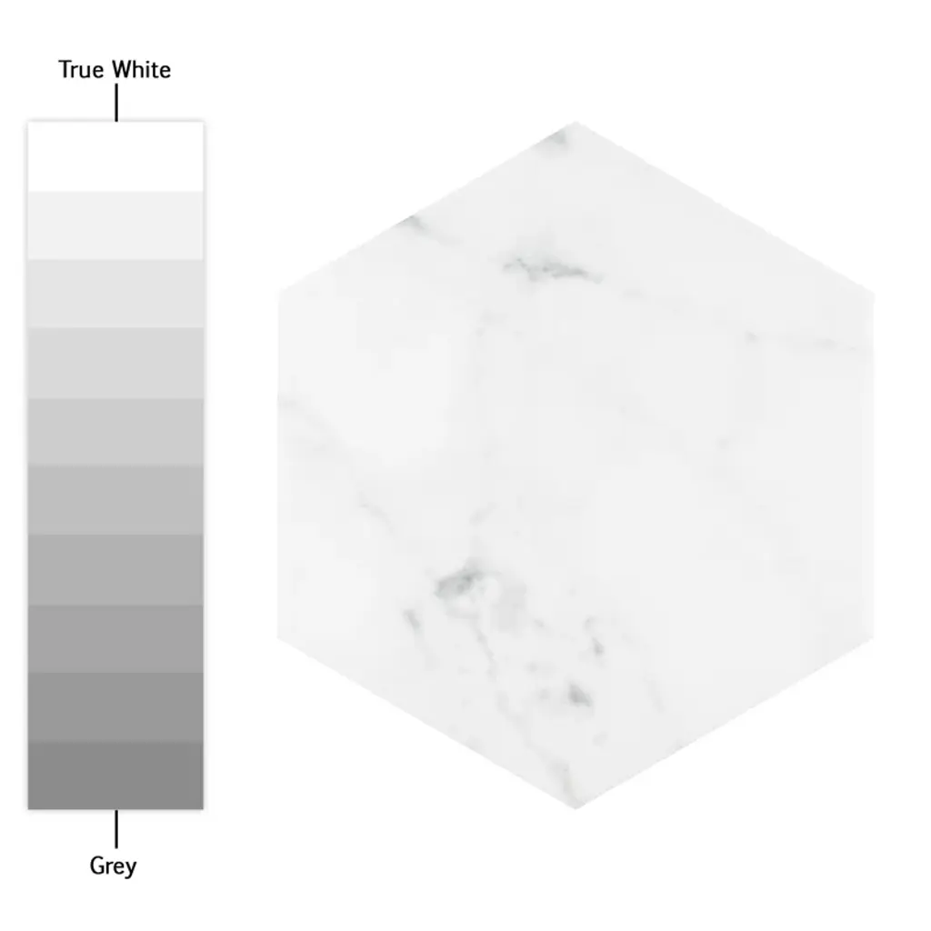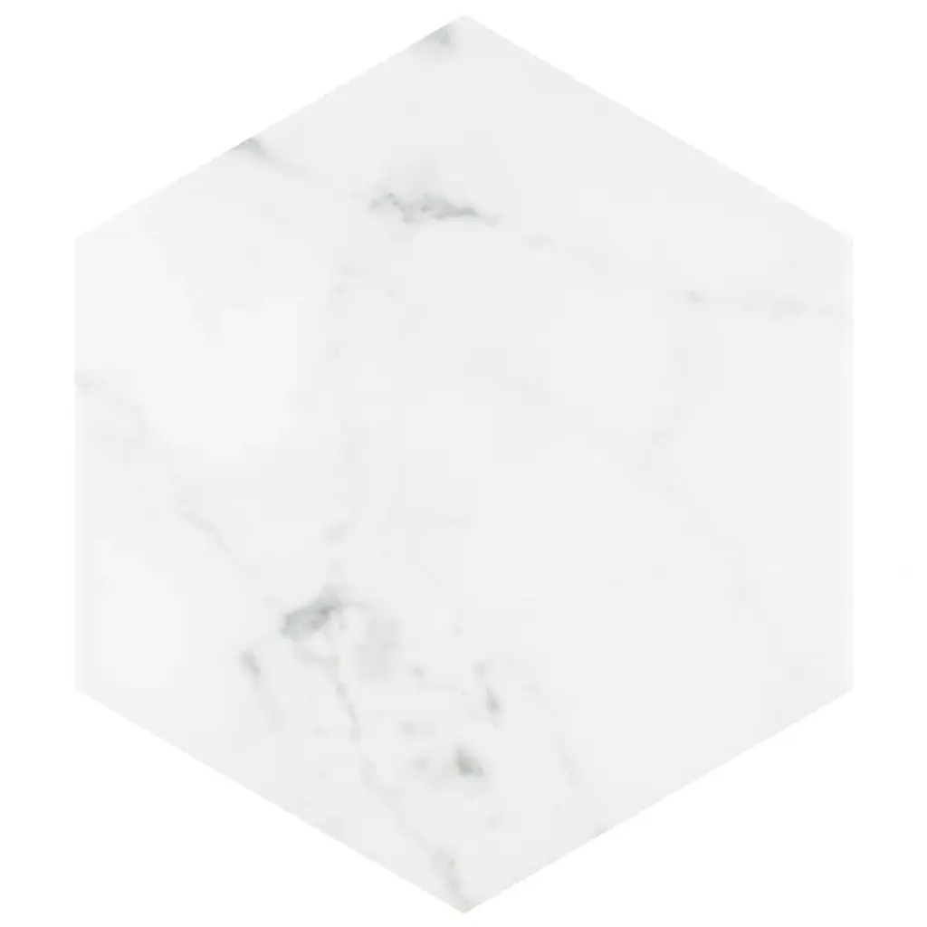 Bring a luxurious feel to your home with this hexagon. This tile features marbleized striations of gray veins on a white background that captures the timeless elegance of Carrara marble. This tile is great for interior or exterior use. This tile matches many different décor styles and is great for both historical restorations and modern renovations.