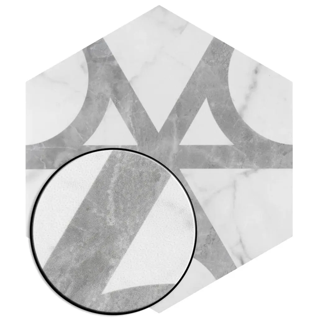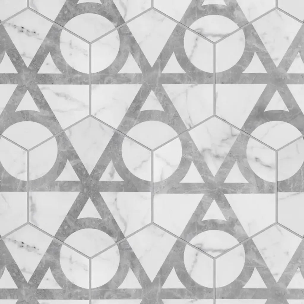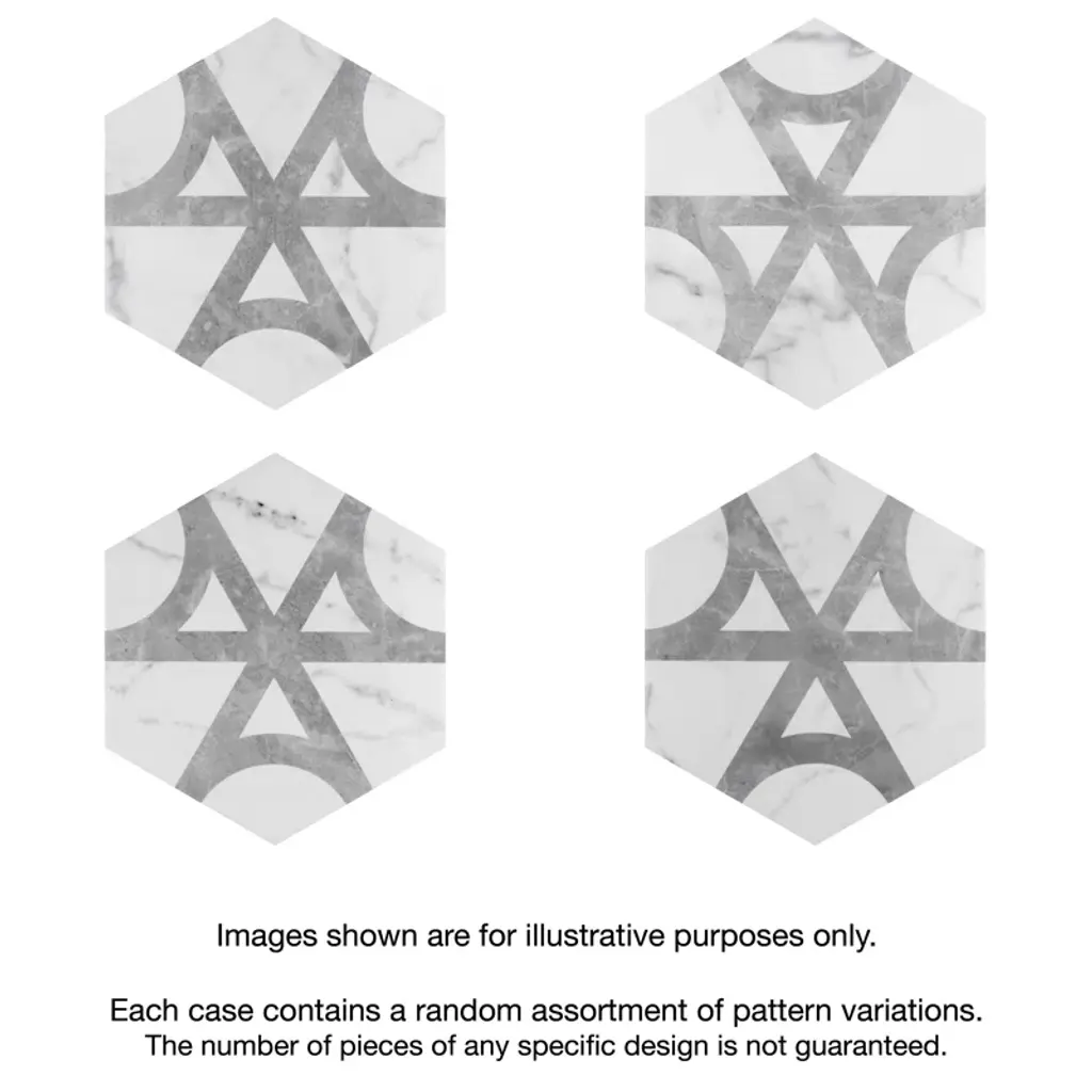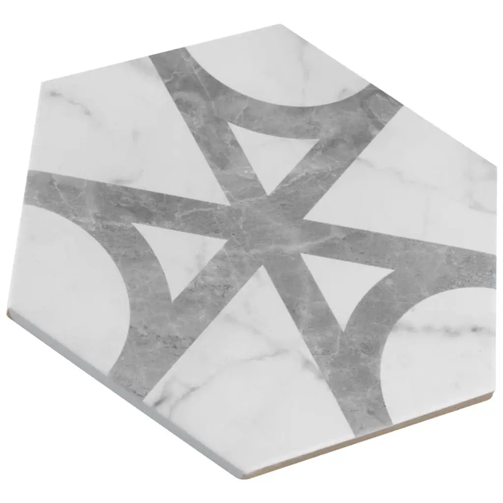 The floor and Wall Tile feature a smooth, matte finish. Meant to capture the appearance of classic Carrara marble, this marbleized porcelain tile offers this timeless look in a durable, easy-to-maintain option. The final addition to this timeless piece is the gray marbleized centered geometric design that features a mix of sharp angles and soothing arcs. This hexagonal tile is perfect for any setting, traditional enough for historical renovations or modern enough for new construction. This slip-resistant tile is great for most residential floors, including kitchens, showers, and entryways. Use these alone or mix and match with the coordinating patterned options to create your own unique look.