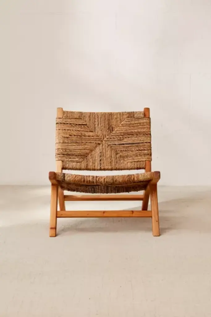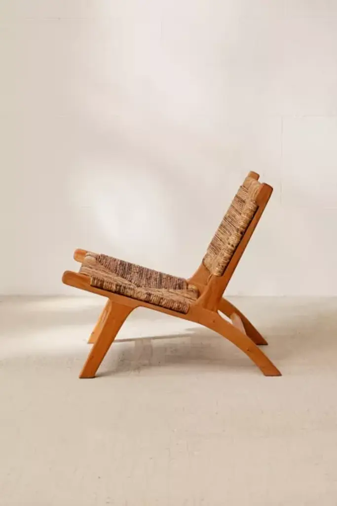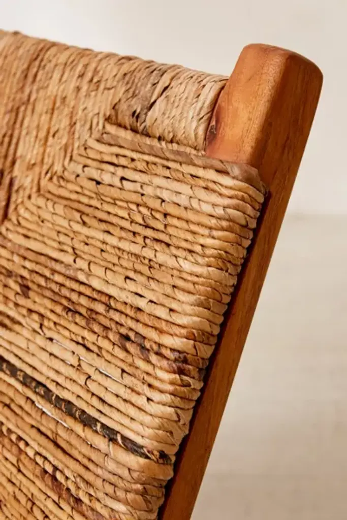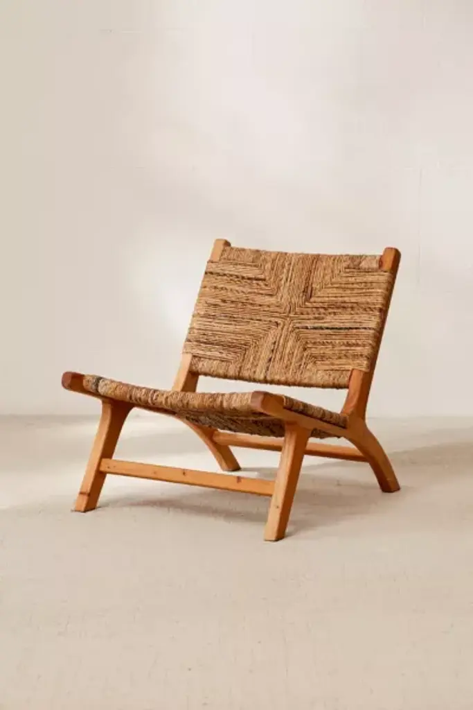 Curl up with a good book in this boho-influenced woven chair. Featuring woven construction at seat and back, crisscrossing in an elaborate pattern that adds depth + dimension to your space while providing an ultra-comfortable angle to sit at. Constructed with mahogany wooden framing that splays out with modern lines and a rich finish. **Features** \- Claudia woven lounge chair \- Mahogany frame with splayed legs \- Woven banana tree bark seat \- Angular seat back for a more comfortable experience **Content + Care** \- Mahogany, banana tree bark \- Wipe clean \- Imported **Size** \- Dimensions: 23.62"l x 31.5"w x 27.76"h \- Seat dimensions: 23.62"l x 31.5"w x 28"h \- Front leg height: 11" \- Back leg height: 14" \- Weight: 20 lbs \- Shipping package dimensions: 31.9"l x 24"w x 28.3"h \- Shipping package weight: 20 lbs Fulfilled by one of our vendors, this item may take longer to process than other items in your order and will ship separately.