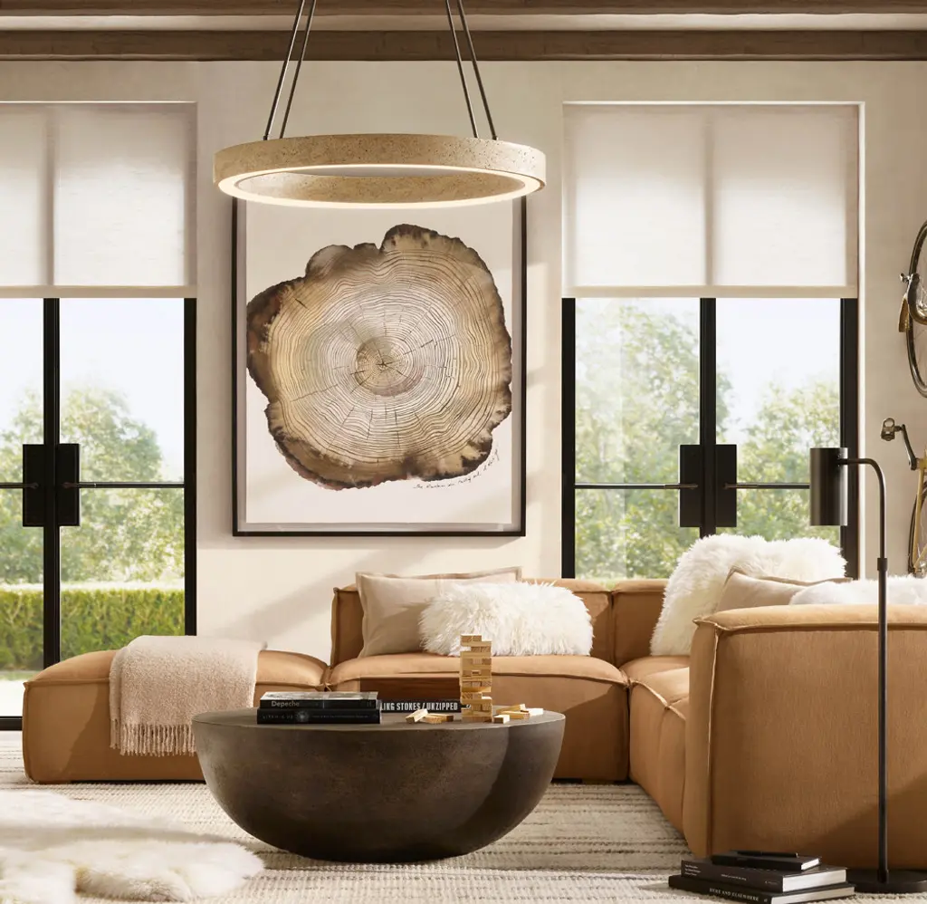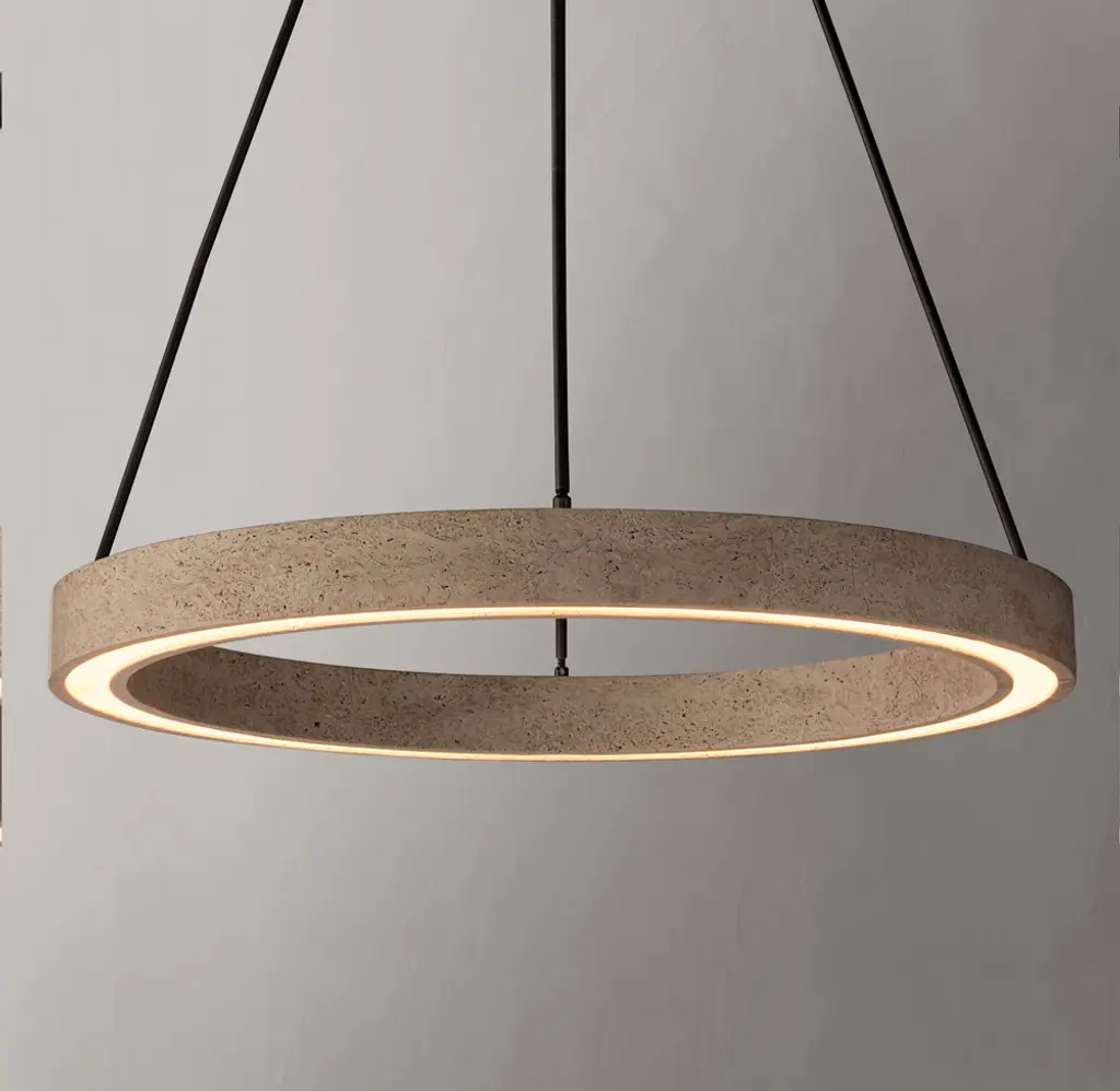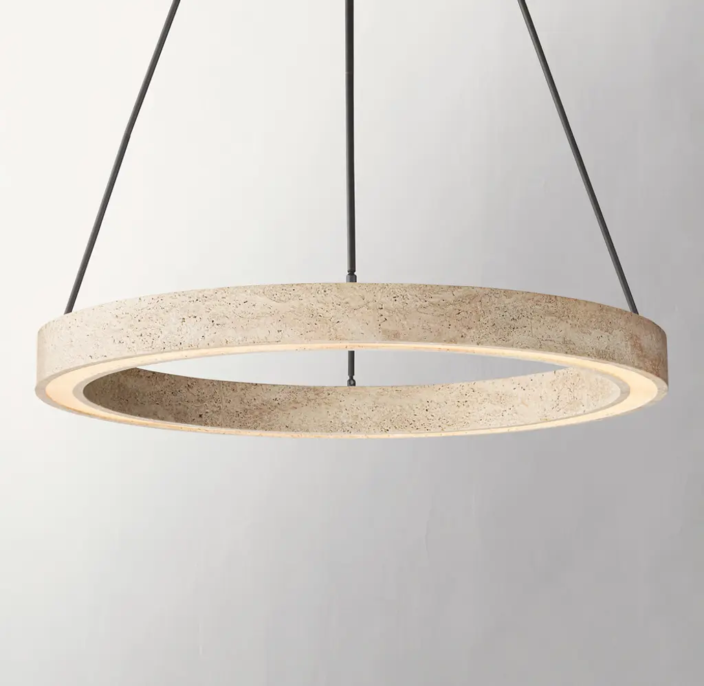 Carved Italian travertine makes the rounds in our beautifully restrained pendant. A steel frame suspends a circular shade with integrated LED that glows from within, casting diffuse light. The distinctive veining and organic texture inherent in the stone make each light unique.