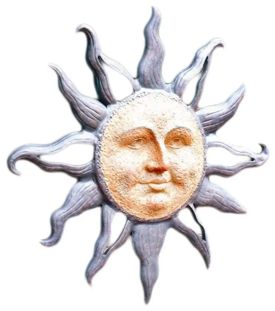 This rustic clay sun measures about 12 inches in diameter. We will have two colors in this design: Red and Turquoise. Each is unique, handmade and the photo is a representation of what you will receive...same design, look, etc. Colors will vary slightly as each is hand painted. It has a hanger in the back for easy hanging. If you are putting them outside, we suggest several coats of a sealer, ie, polyurethane or sparathane.