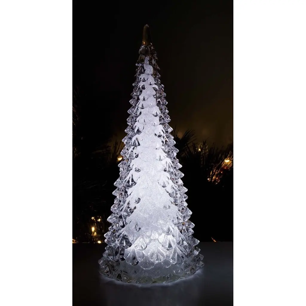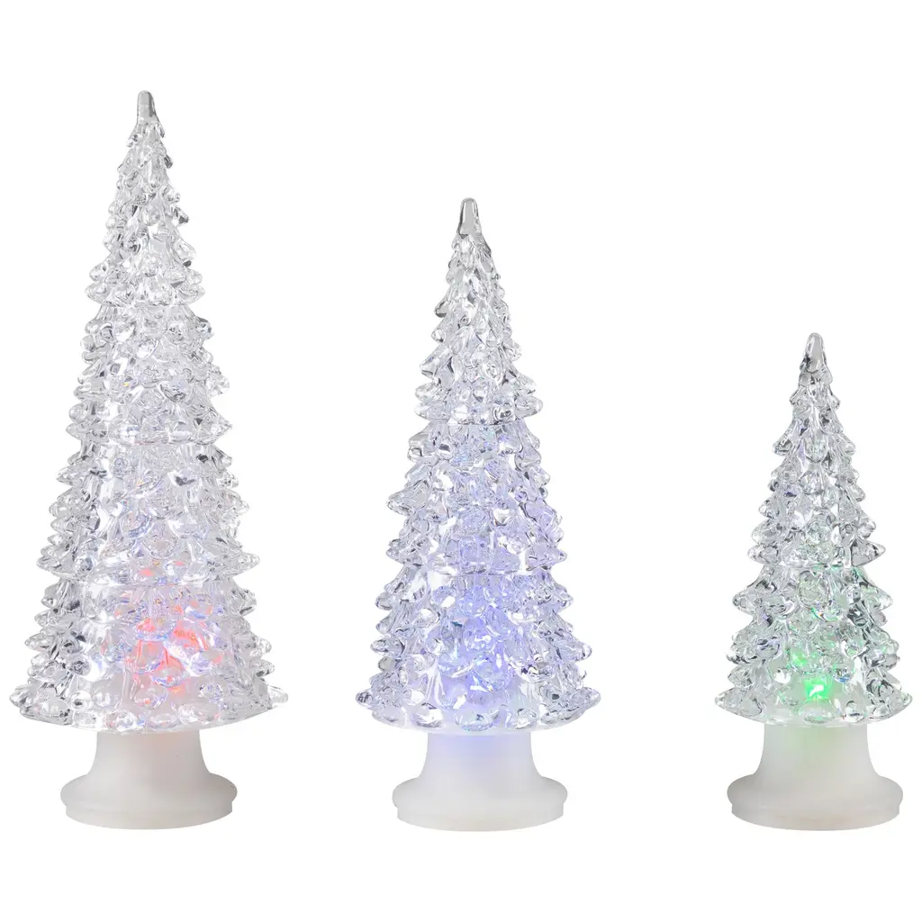 A traditional symbol of Christmas, this set of lighted trees is the perfect way to light up your holiday this season. Illuminated from within by color changing LED lights, the trees crystal like finish disperses the light beautifully. Use as a table decoration all together or display separately as holiday night lights. Product Features: Intricate detailing mimics a pine tree Clear crystal like finish Color changing LED lights in: red, green, dark blue, yellow, light blue, and pink-purple Convenient on/off switch on the base Each tree requires (1) CR2032 button cell battery in each tree - included Dimensions: Small: 5.75"H x 2.25"W x 2.25"D Medium: 7.5"H x 3"W x 3"D Large: 8.5"H x 3.5"W x 3.5"D Material(s): plastic