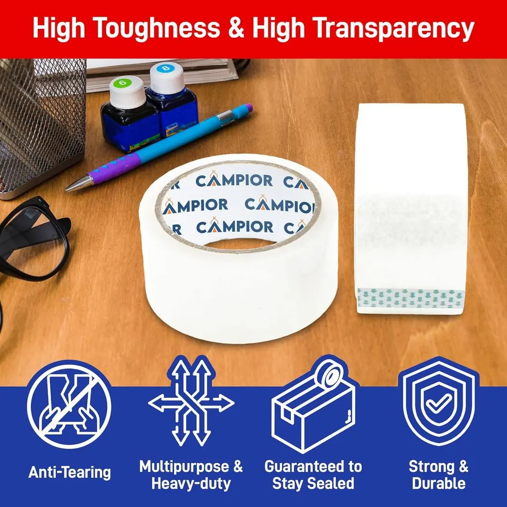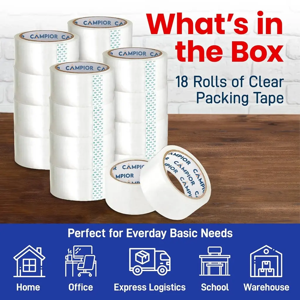 The Campior Clear Packing Tape is a reliable and durable solution for all your packing, shipping, and sealing needs. This cost-efficient pack includes premium-quality clear tape, each measuring providing plenty of tape for both personal and professional use. Designed with industrial-strength BOPP acrylic adhesive, it ensures a strong, instant seal that keeps your boxes and packages secure during transit, even through rough handling. With a thickness of mil, this heavy-duty tape is resistant to splitting, tearing, and slivering, offering added durability for sealing heavier boxes. The smooth application makes it easy to use by hand or with a tape dispenser, perfect for efficiently packing up moving boxes or shipping items. Its versatile design is also great for household tasks like removing pet hair or securing storage boxes, making it an essential tool for any home or business.