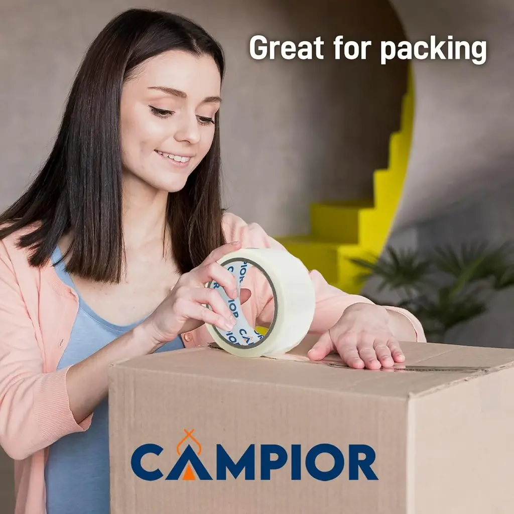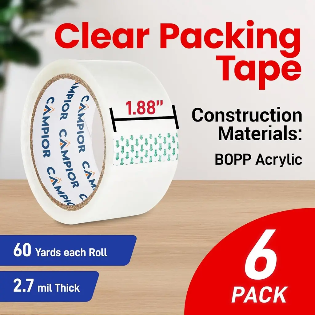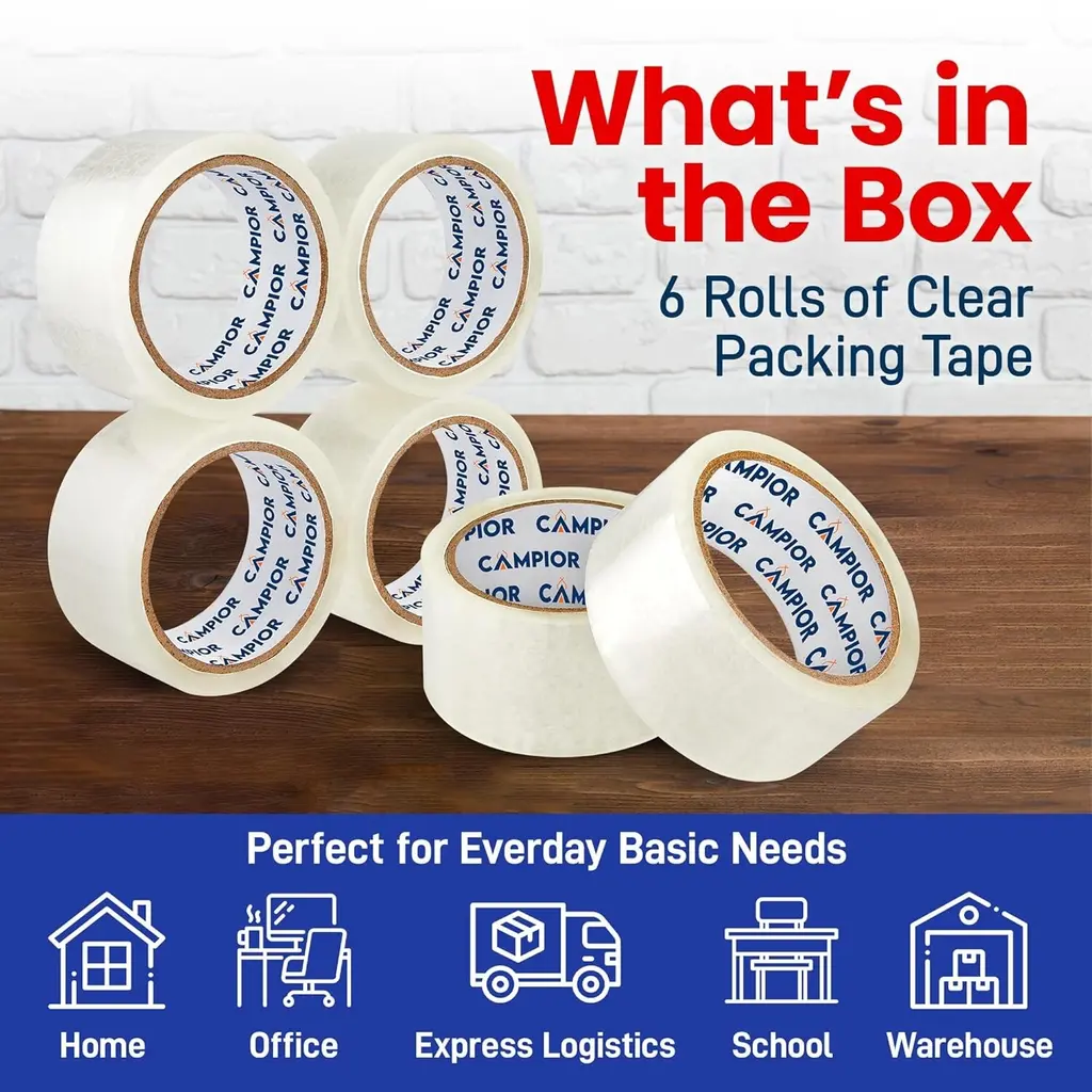 The Campior Clear Packing Tape is a reliable and durable solution for all your packing, shipping, and sealing needs. This cost-efficient pack includes premium-quality clear tape, each measuring providing plenty of tape for both personal and professional use. Designed with industrial-strength BOPP acrylic adhesive, it ensures a strong, instant seal that keeps your boxes and packages secure during transit, even through rough handling. With a thickness of mil, this heavy-duty tape is resistant to splitting, tearing, and slivering, offering added durability for sealing heavier boxes. The smooth application makes it easy to use by hand or with a tape dispenser, perfect for efficiently packing up moving boxes or shipping items. Its versatile design is also great for household tasks like removing pet hair or securing storage boxes, making it an essential tool for any home or business.
