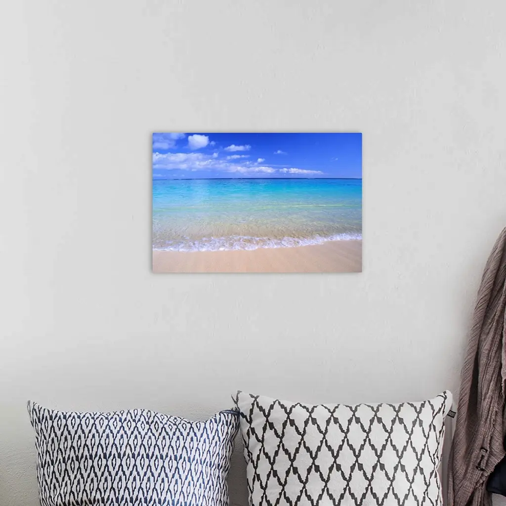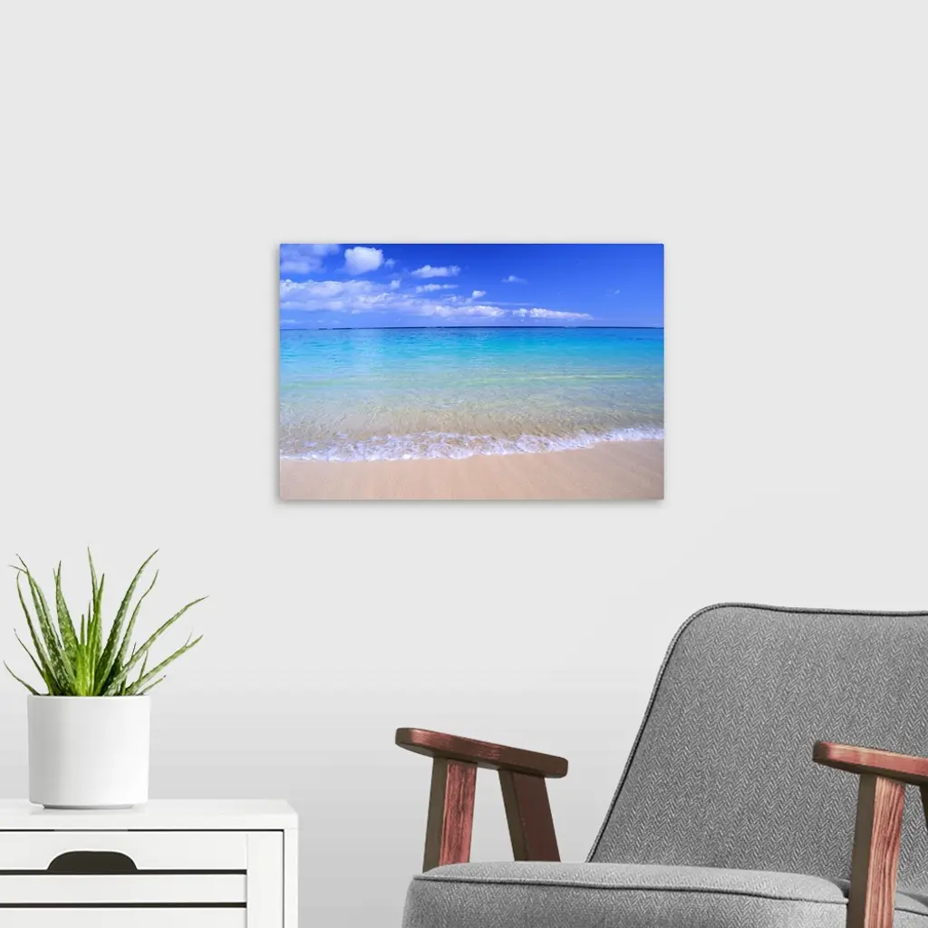 This home docor features a photograph that is a horizontal seascape of clean ocean water washing up on a sandy beach.