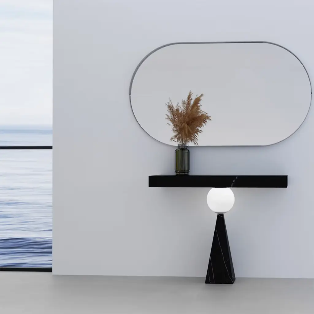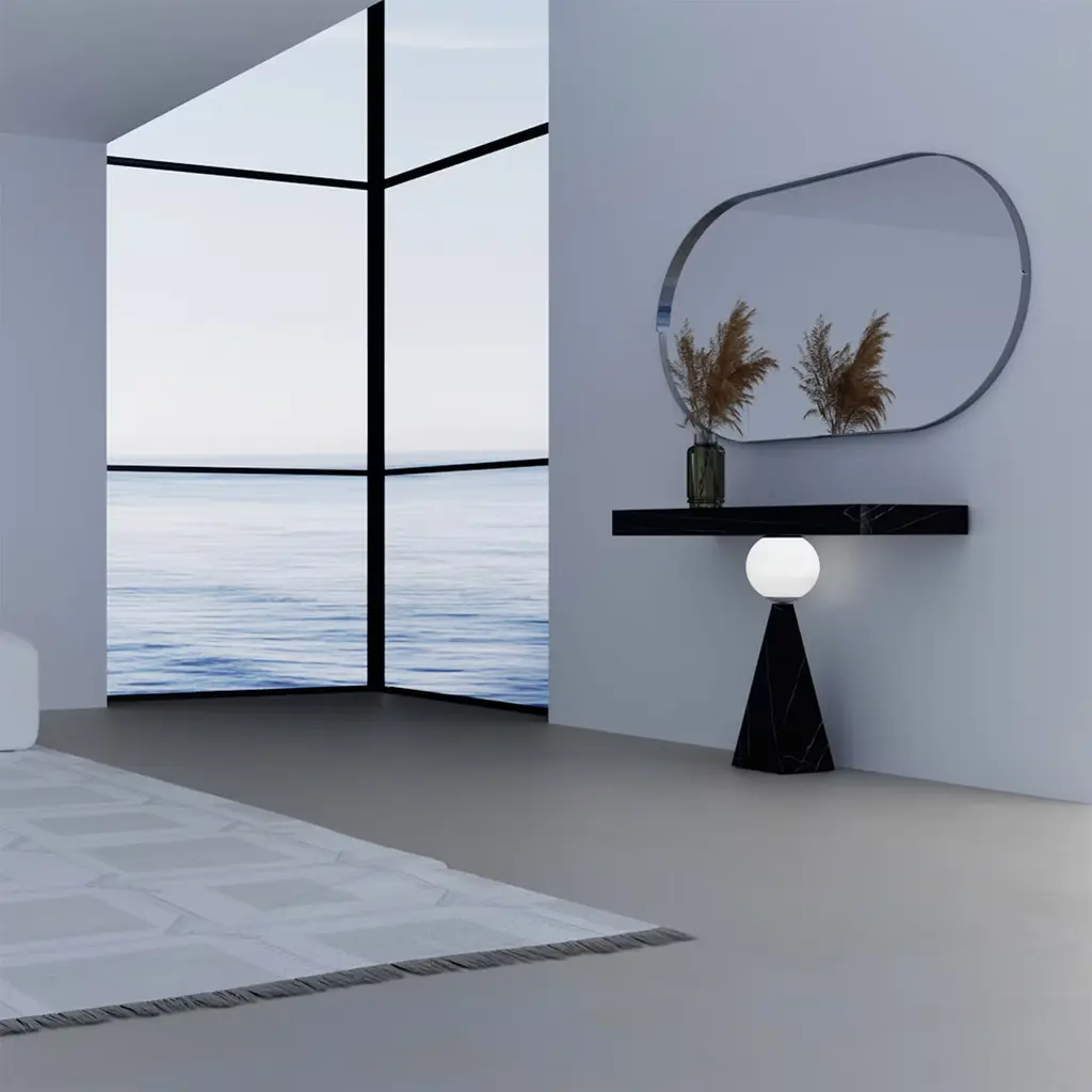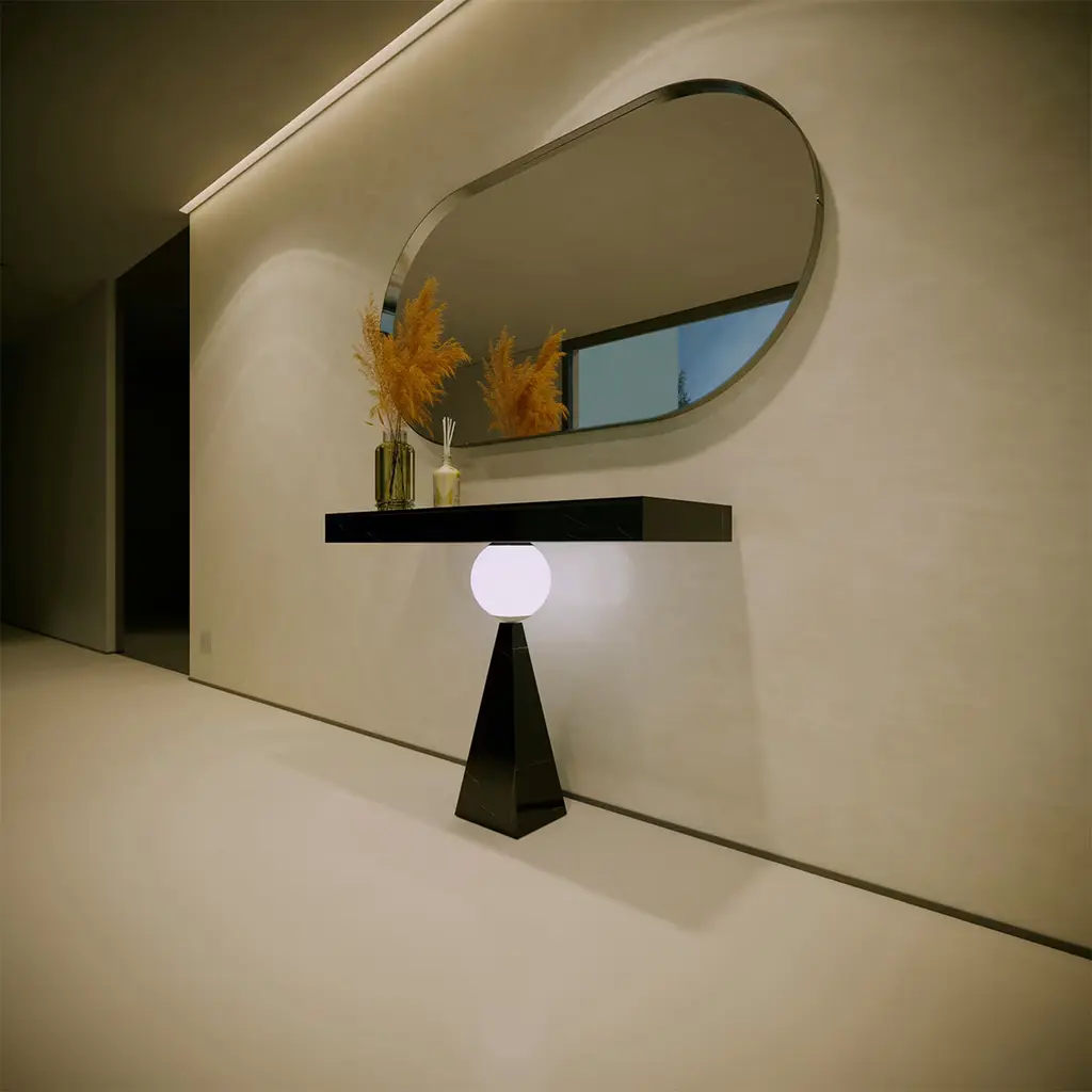 Modern sculpture where a pyramidal base supports a block of stone, in a seemingly unstable balance, through an illuminated sphere . The location of the console is free as battery powered.