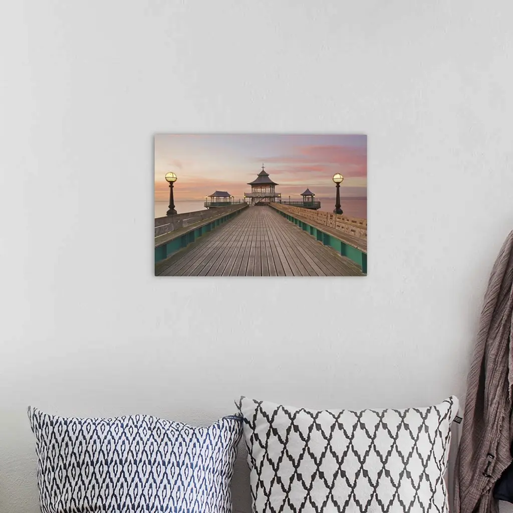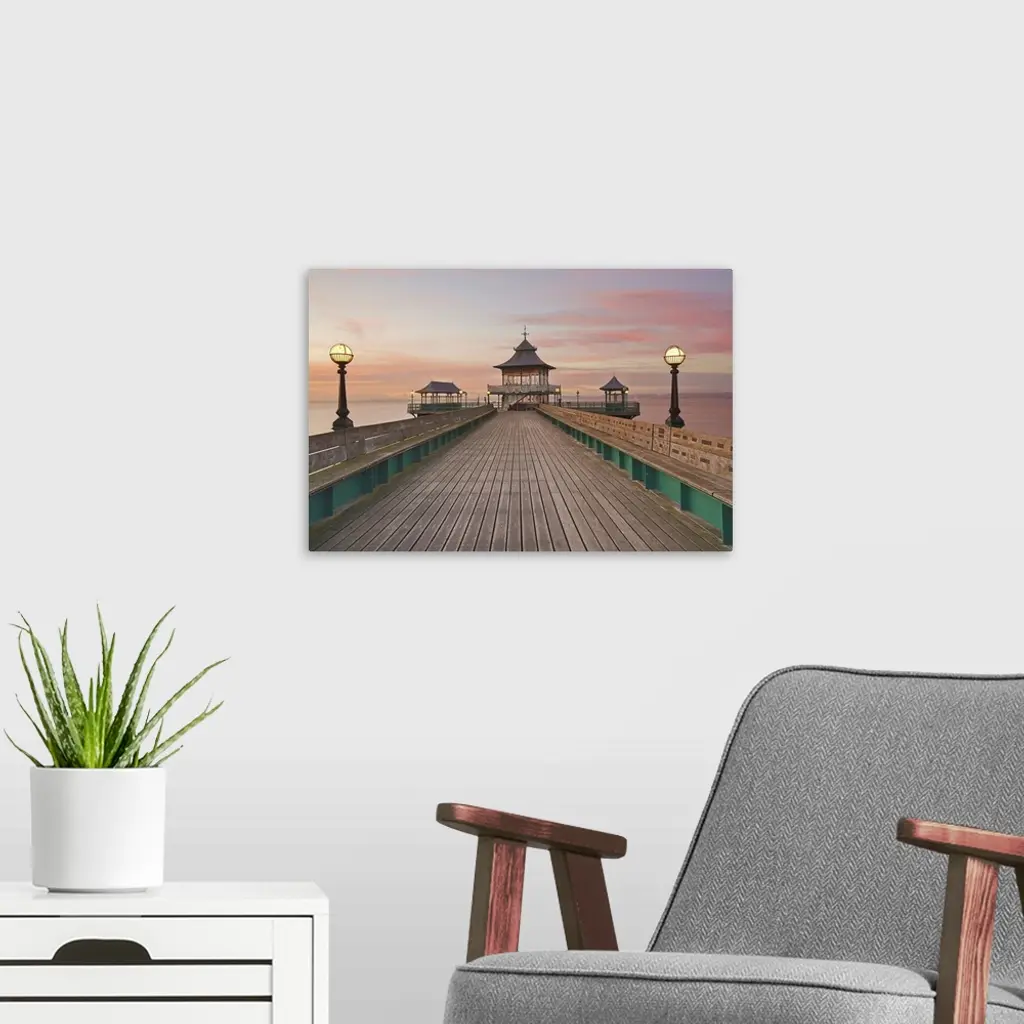 A dusk view of Clevedon Pier, in Clevedon, on the Bristol Channel coast of Somerset, England, United Kingdom, Europe