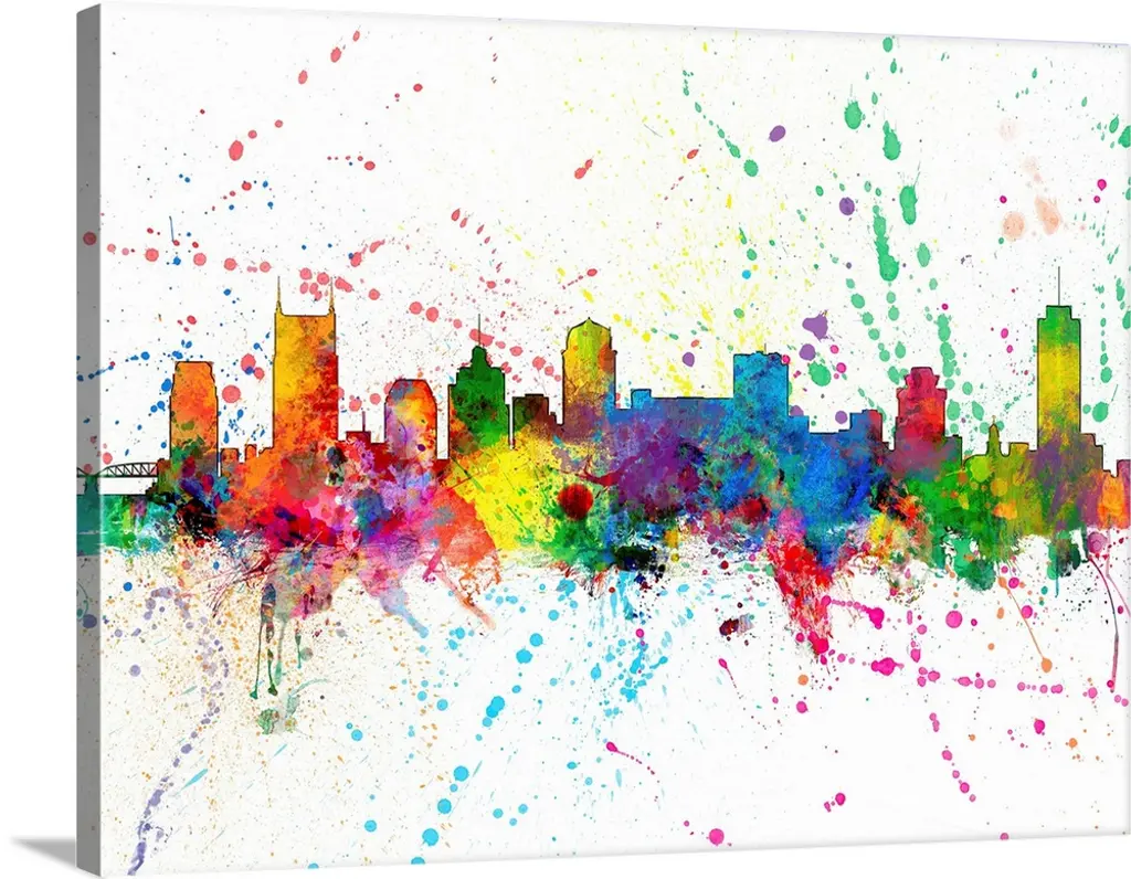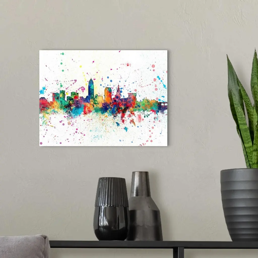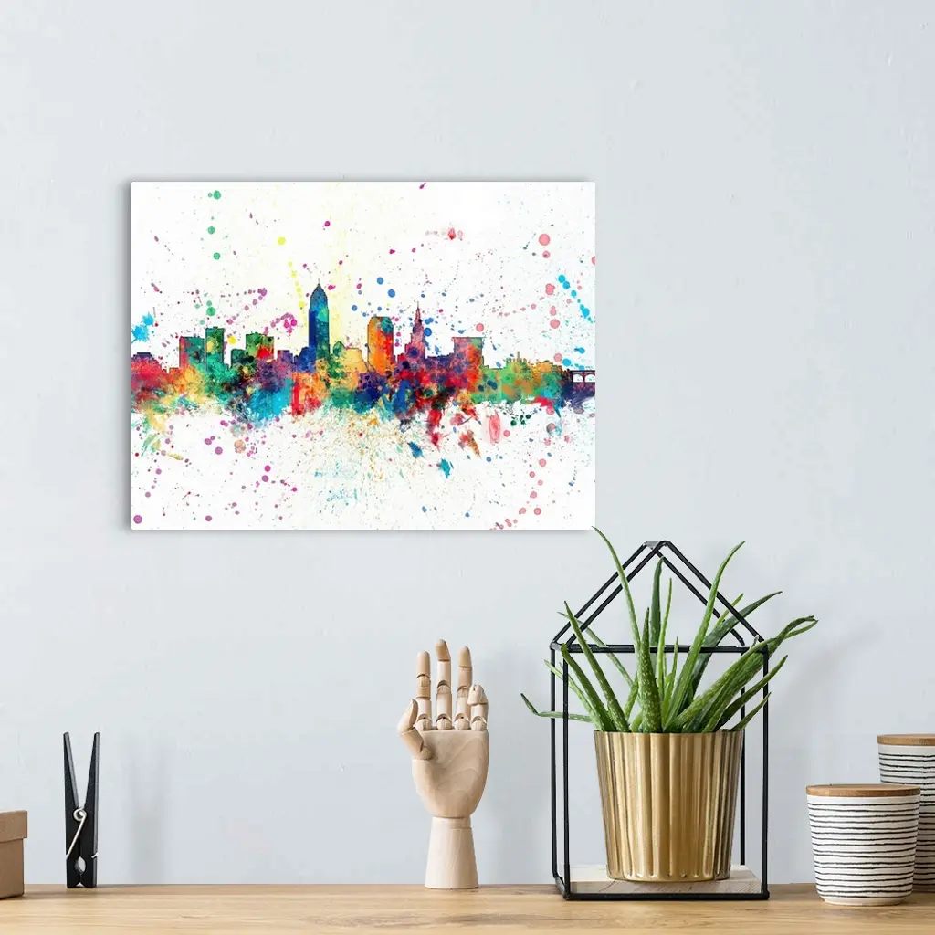 Wild and vibrant paint splatter silhouette of the Cleveland skyline.