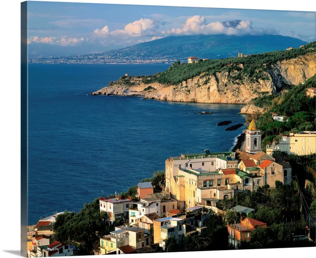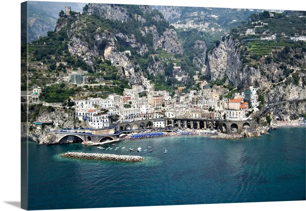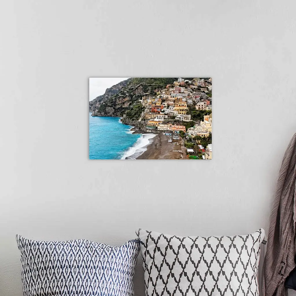 High angle close up view of the beach and Town of Positano, Campania, Italy.