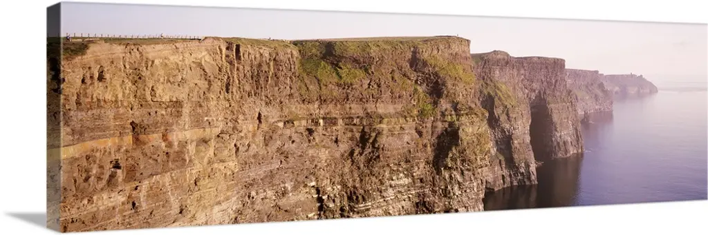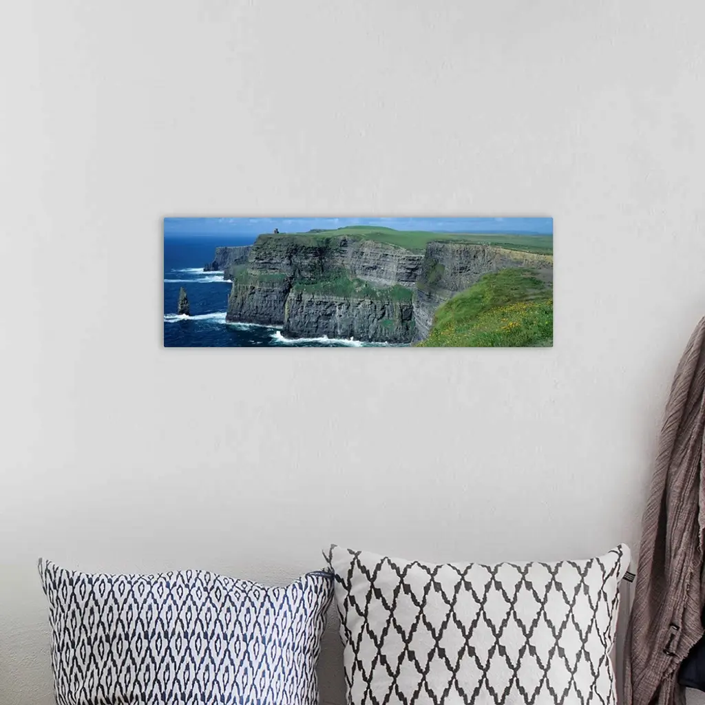 Panoramic photograph of the Cliffs of Moher County Clare in Ireland on a sunny day.