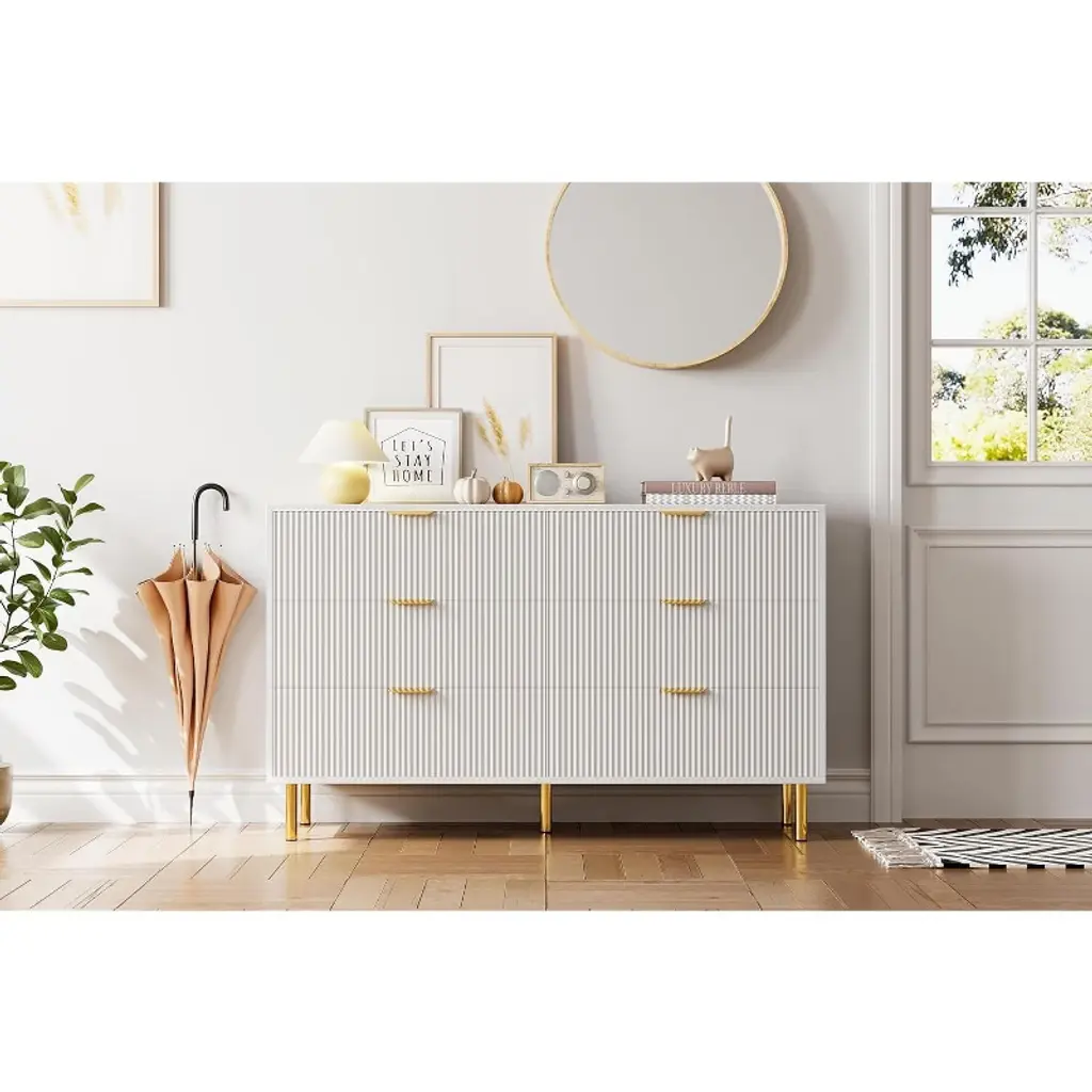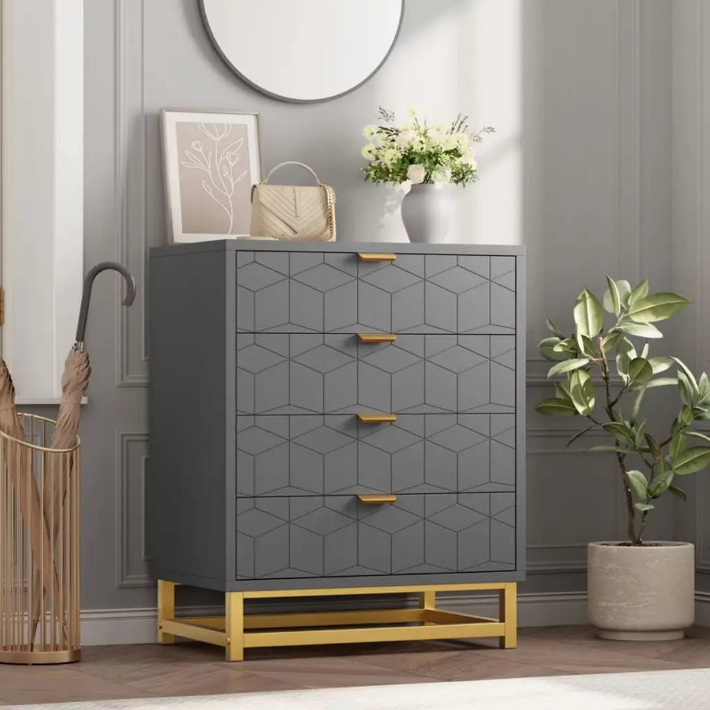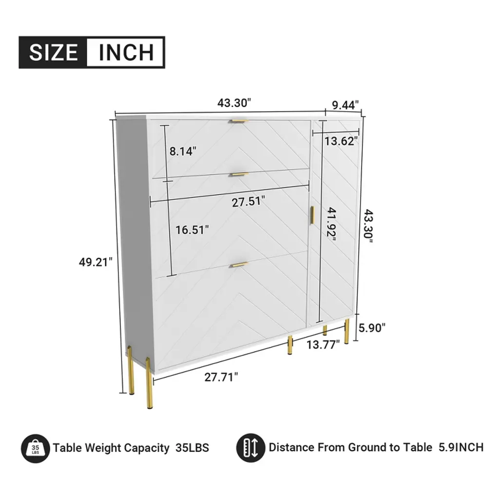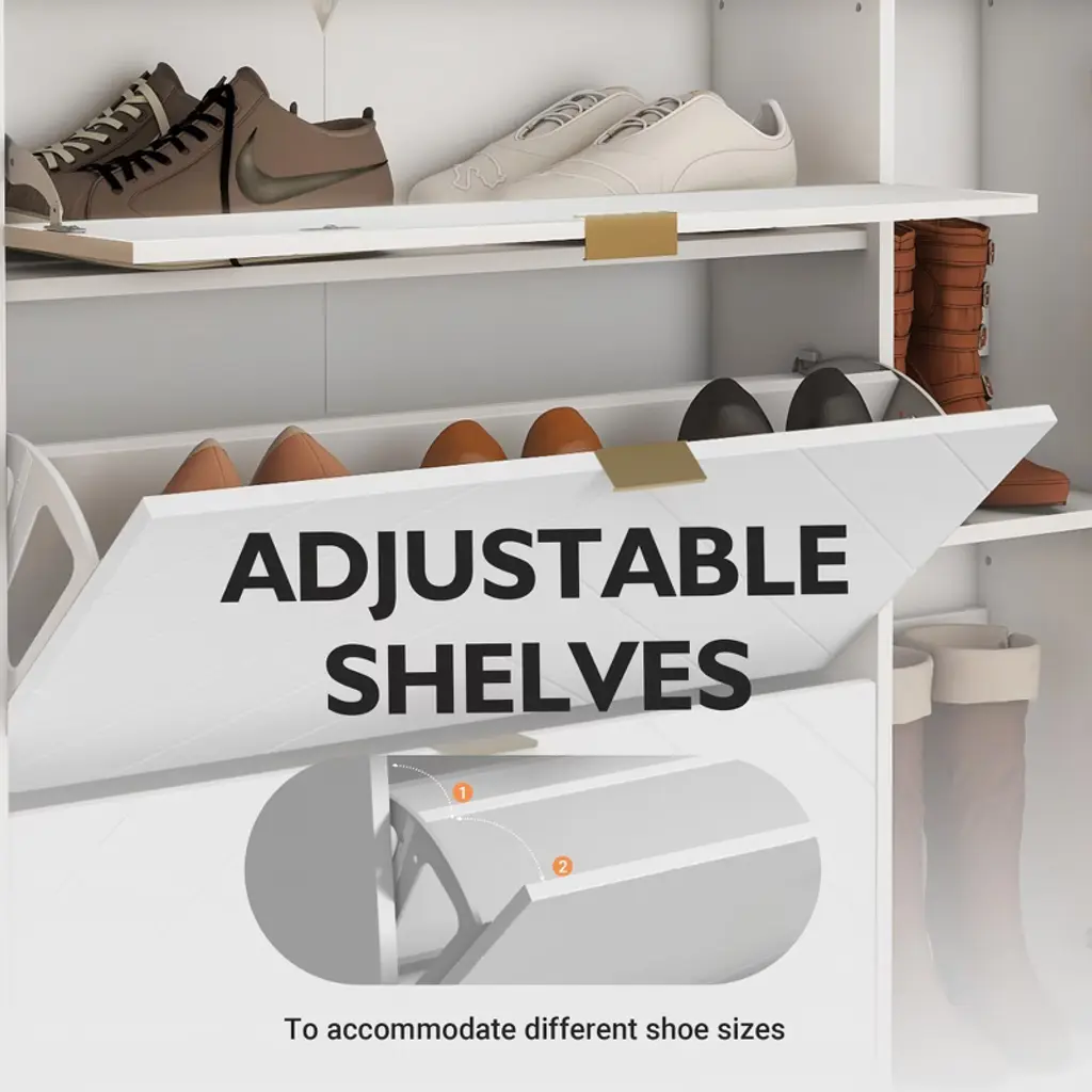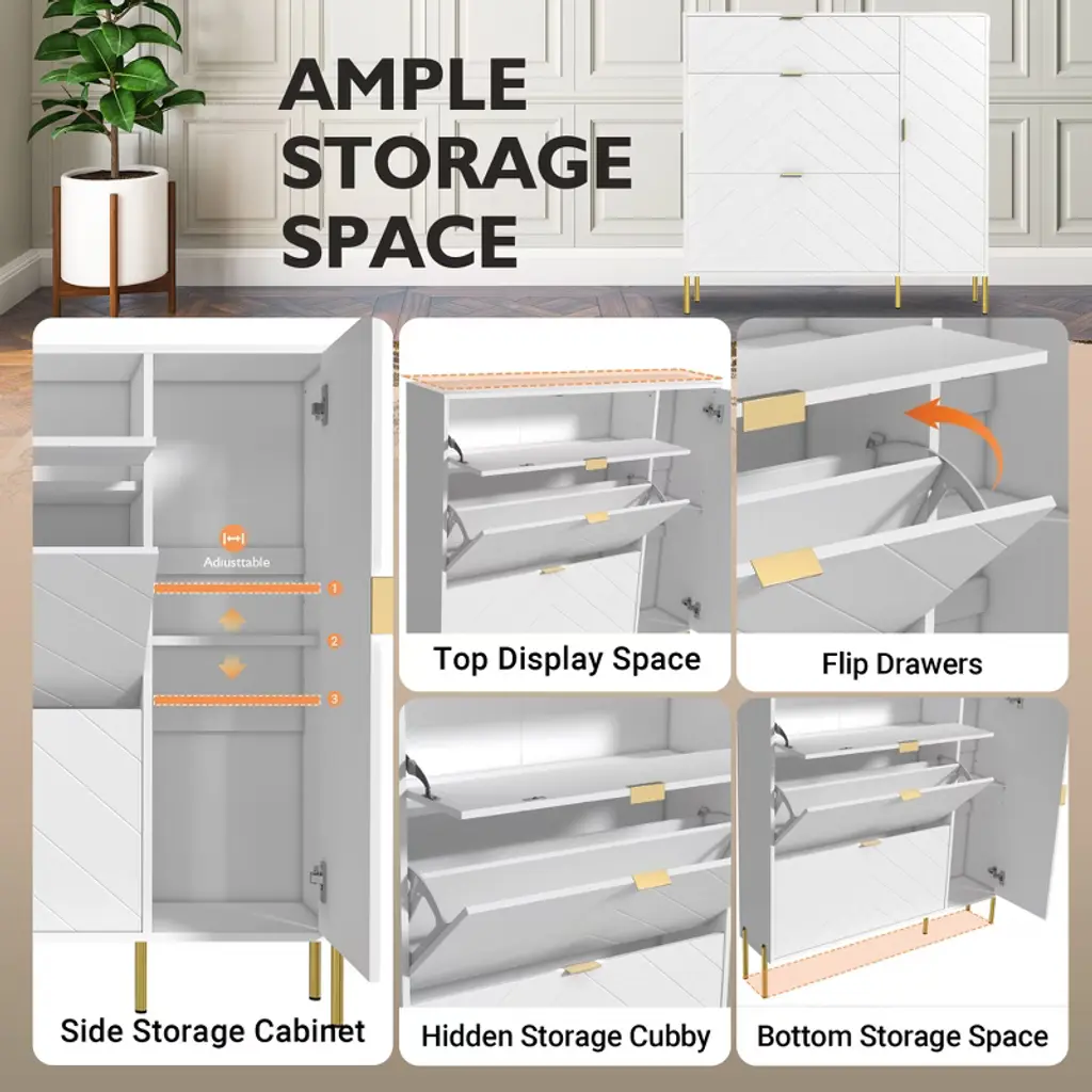 Keep your entryway neat and stylish with this large-capacity modern shoe cabinet. Featuring two flip-out drawers that hold up to 16 pairs of shoes, plus adjustable shelves for boots, it offers functional storage with a fashionable flair. The herringbone surface, gold-finished hardware, and anti-tip design combine beauty and safety for any home.