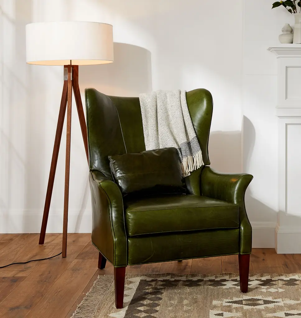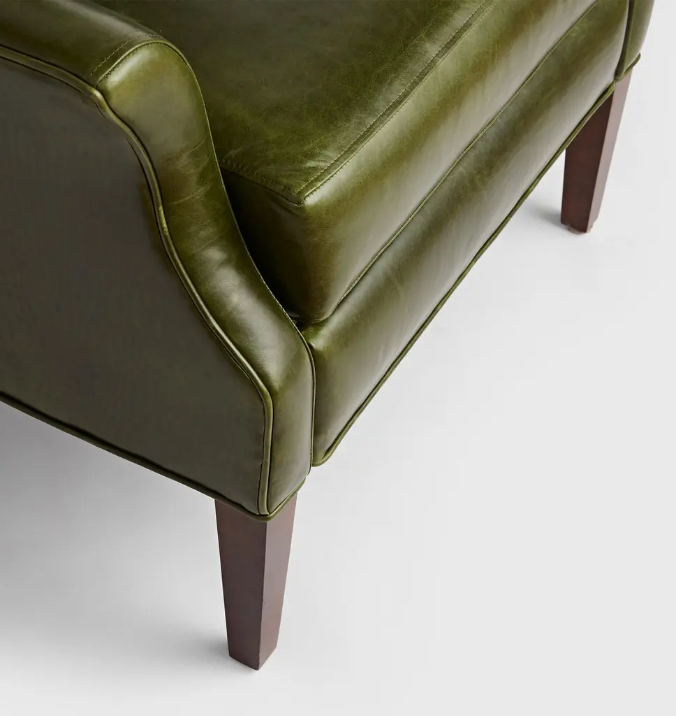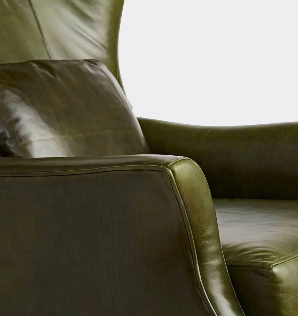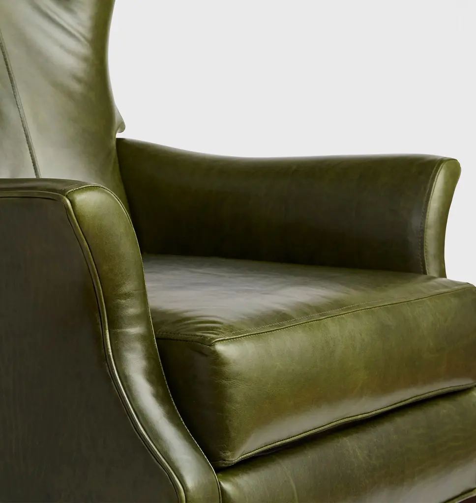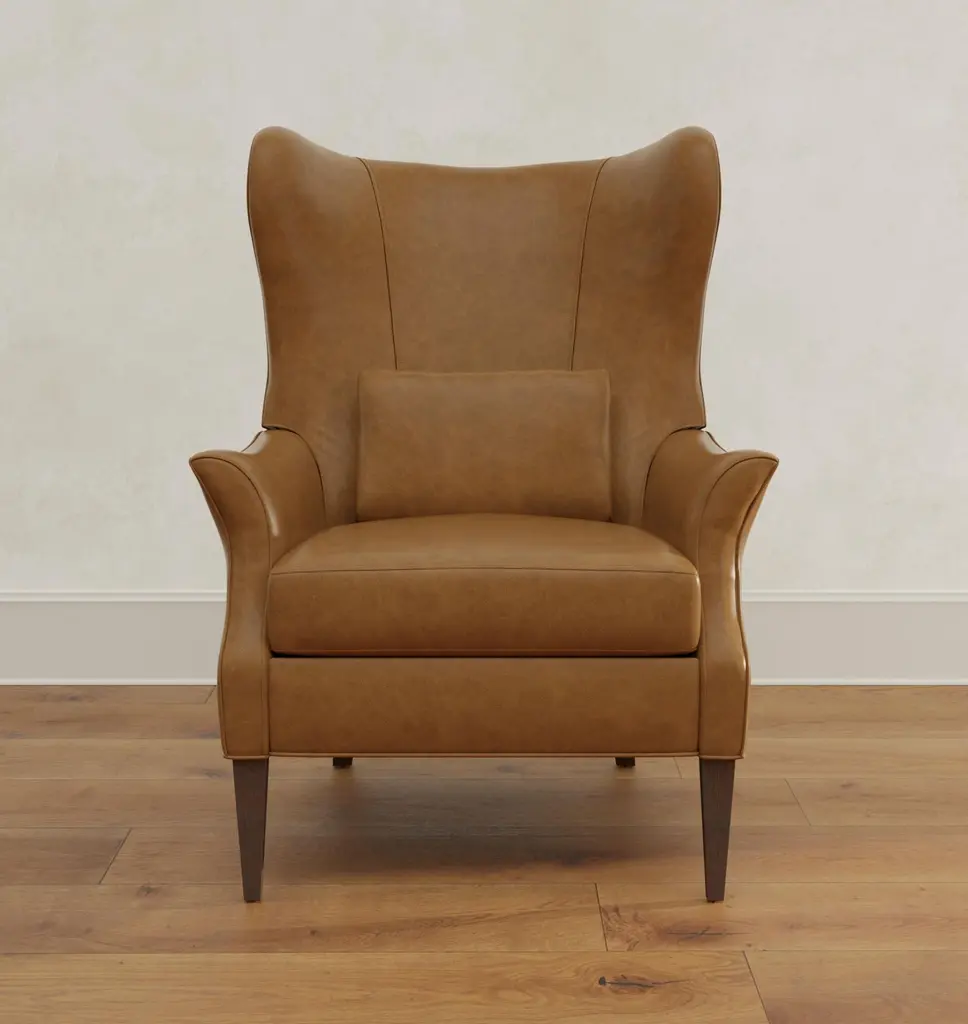 Now available as a premium manual recliner, the Clinton offers a modern update on the wingback chair, a style popularized in the 1700s and a living room staple ever since. This design features elegant leather upholstery and a matching accent pillow.