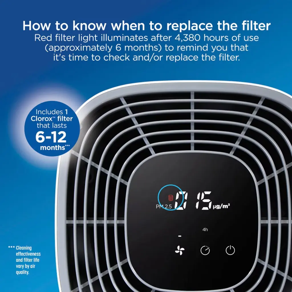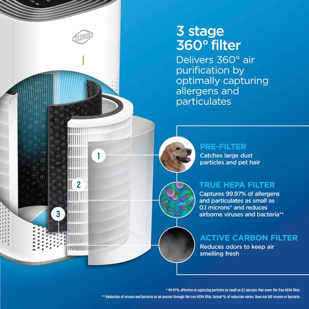 Clorox® is a trusted brand for powerful cleaning and has helped families for over 100 years. The Clorox™ 320 Large Room True HEPA Replacement Filter builds on our trusted legacy by helping you protect your family from allergens, pet dander, dust, smoke, viruses, bacteria and more. It captures 99.97% of allergens and particulates* and reduces viruses and bacteria** so you can breathe easier. The 3 stage 360° filter delivers 360° air purification by capturing particulates in 3 filters: a pre-filter, True HEPA filter and active carbon filter. Fits Clorox™ 320 Sq. Ft. Large Room Air Purifier model # 11010 and Clorox™ 320 Sq. Ft. Large Room Smart Air Purifier model # 11011. Includes 1 Clorox™ filter that lasts 6-12 months.***