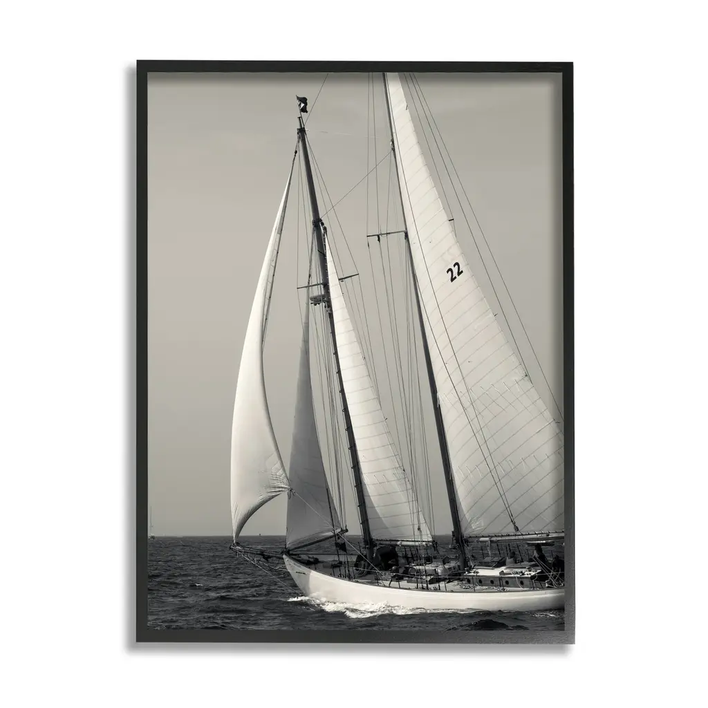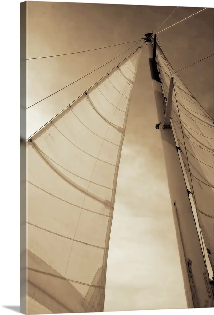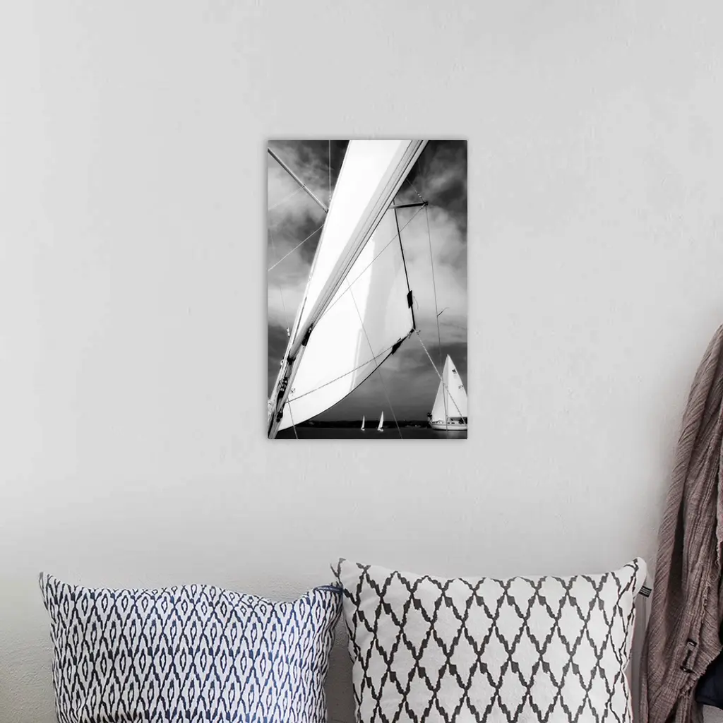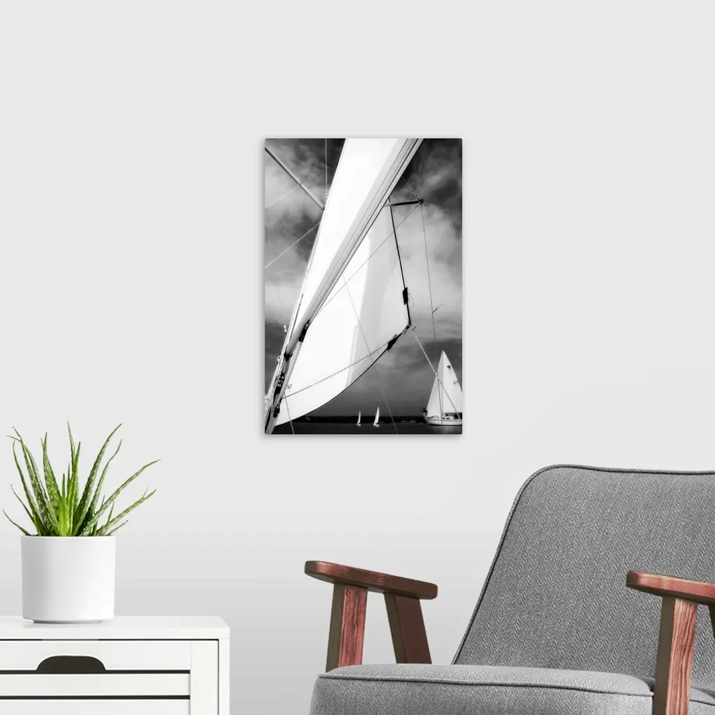 Giant, vertical, close up photograph of a sail blowing in the wind, in front of a cloudy sky. Several smaller sailboats can be seen in the background.